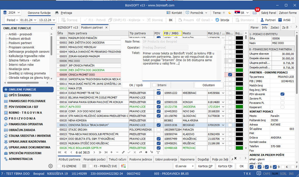 - Ažuriranje poslovnih podataka poslovnih partnera (matični broj, PIB, tekući računi) uključujući i informaciju o eventualnoj blokadi računa