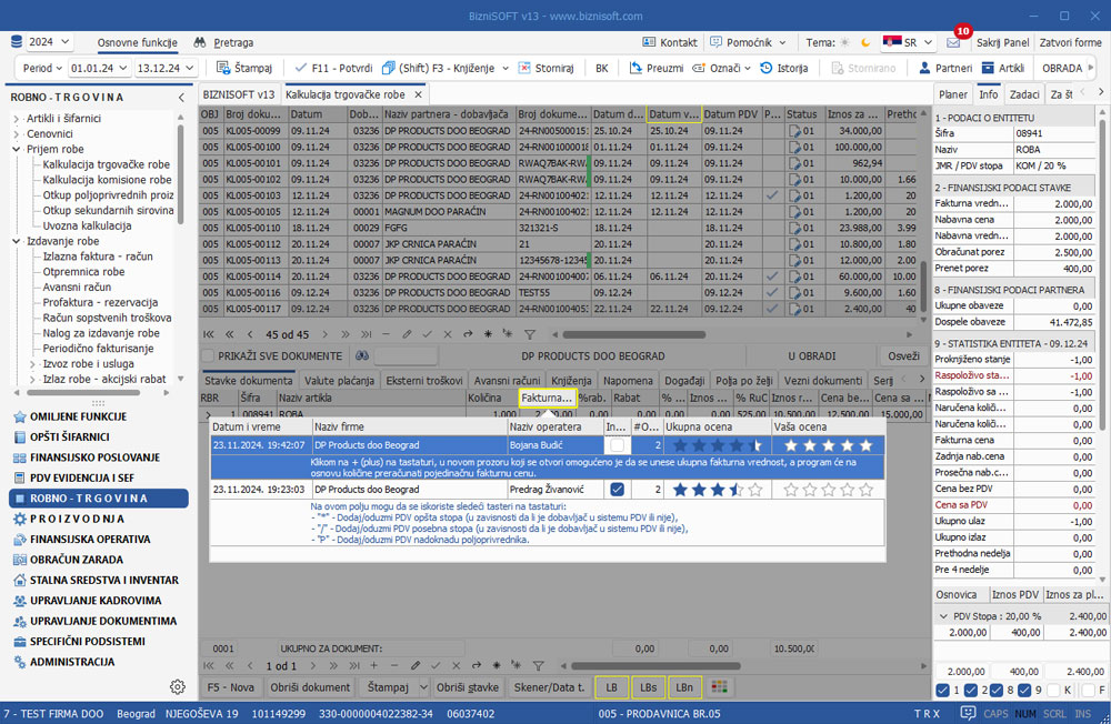 - Kreiranje ulaznih kalkulacija i naloga troška na osnovu primljenih eFaktura i/ili fiskalnih računa