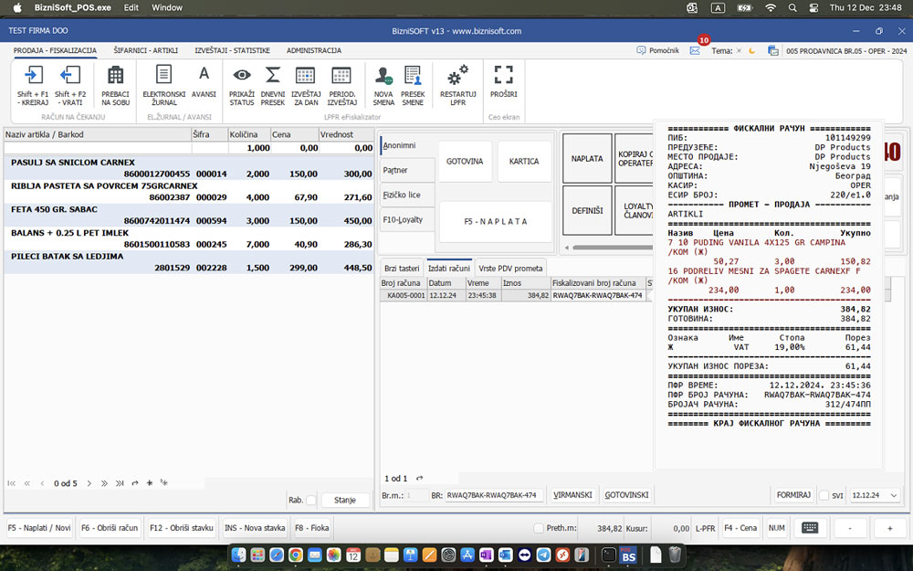 BizniSoft POS je poseban program koji služi za izdavanje fiskalnih računa i rad u maloprodaji u skladu sa aktuelnim Zakonom o fiskalizaciji (ESIR). Program pokriva kompletno poslovanje maloprodajnih objekata uključujući i prodajne akcije, loyalty, vezu sa mernim vagama, platnim terminalima, ručnim terminalima i slično. U okviru ovog sistema podržano je i celokupno restoransko poslovanje (stolovi, prostori, narudžbine, konobari ...).