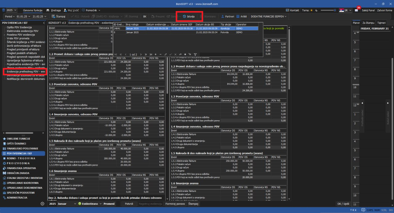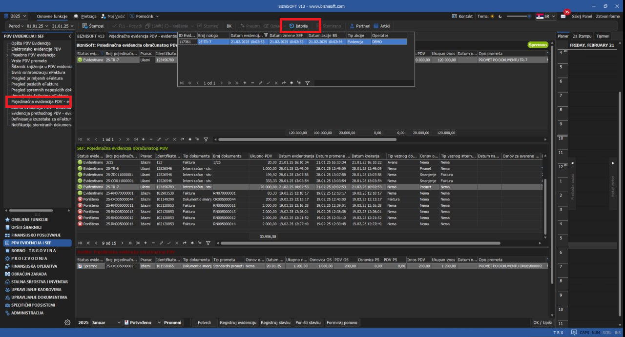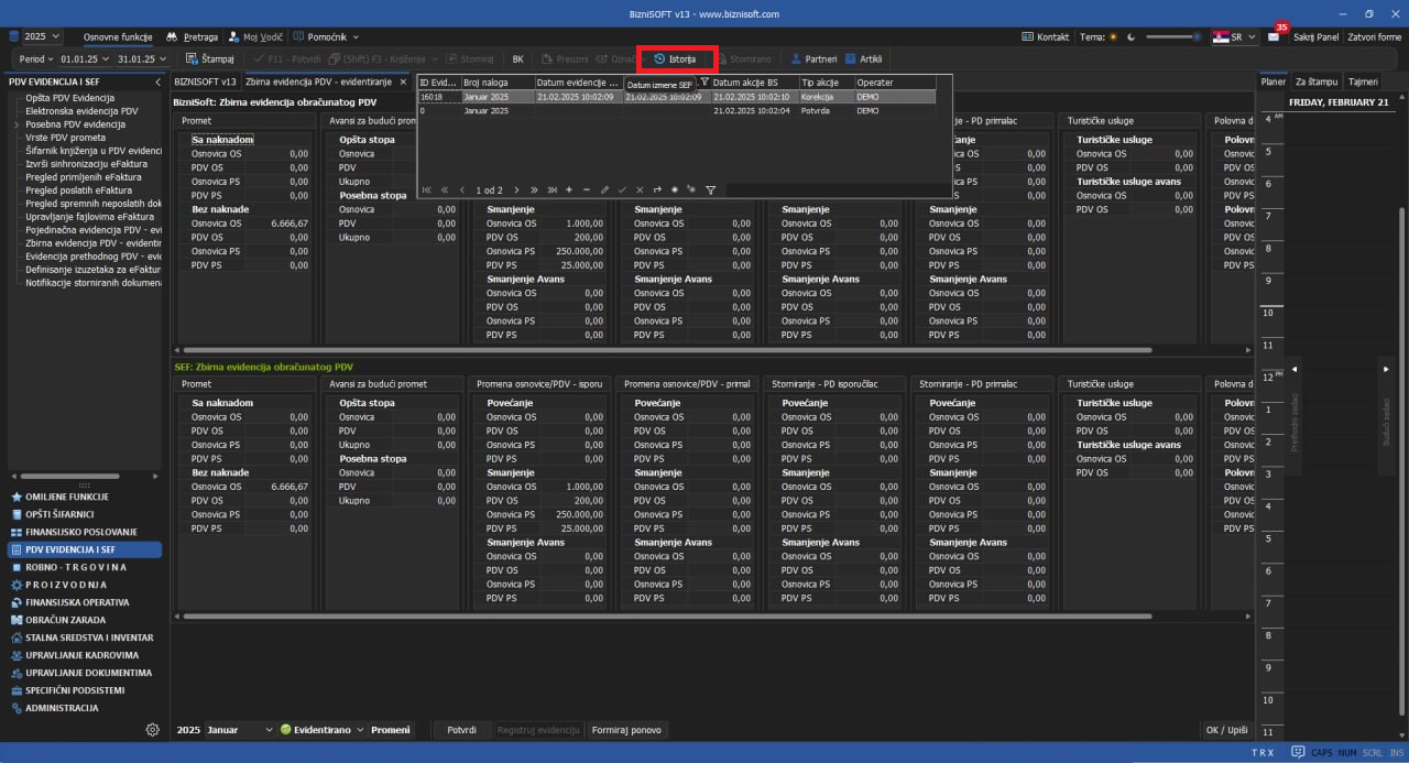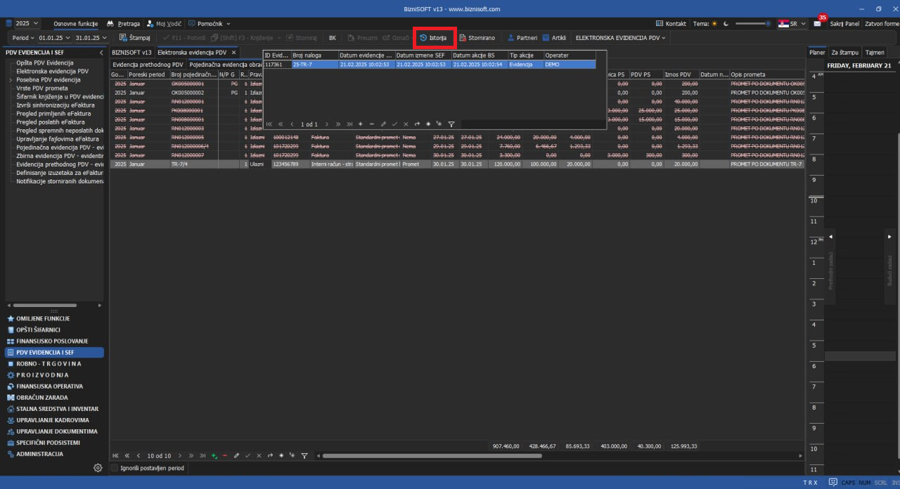Implementirana je istorija evidentiranja u delu PDV Evidencija i SEF u svim evidencijama (vreme evidentiranja, podnošenja i korigovanja elektronskih prijava od strane operatera), standardnim klikom na dugme Istorija u zaglavlju: