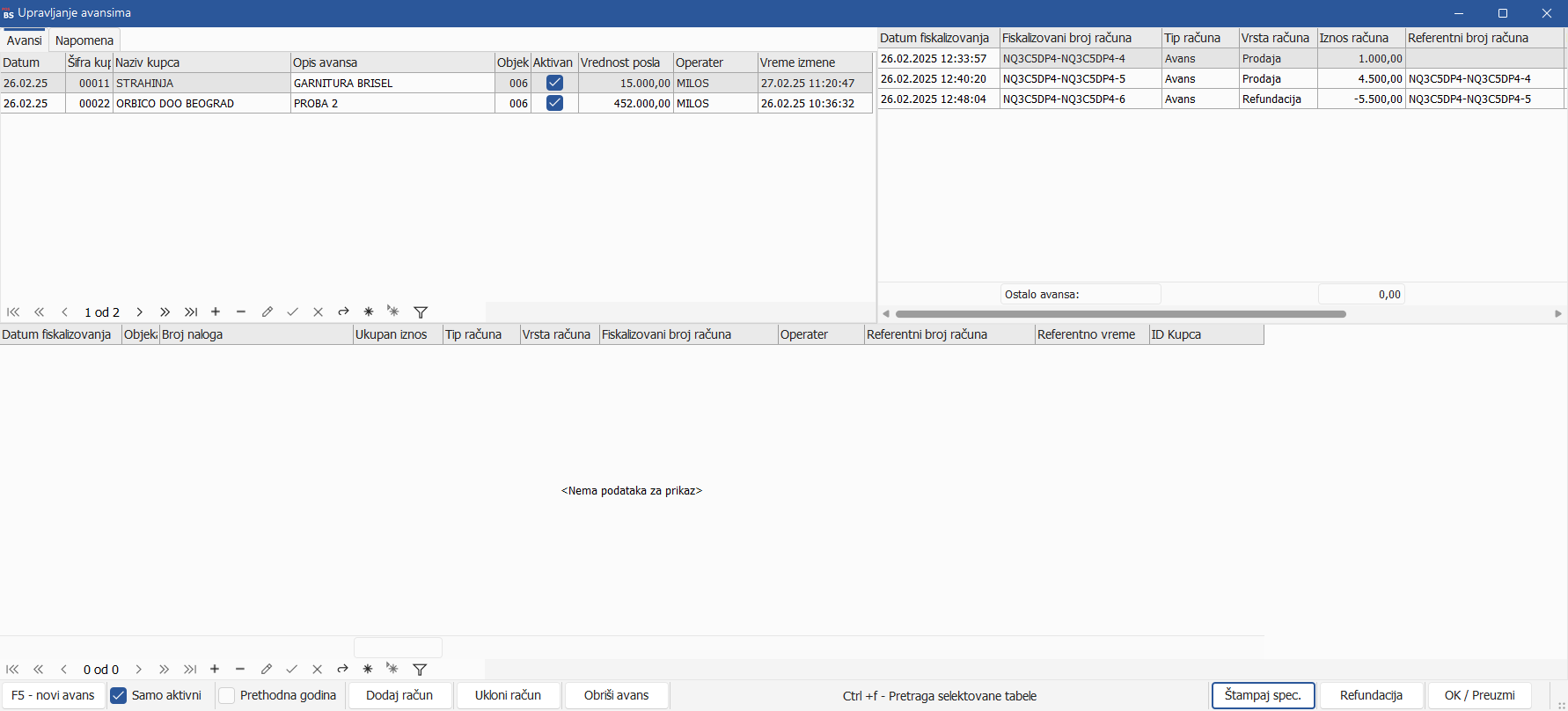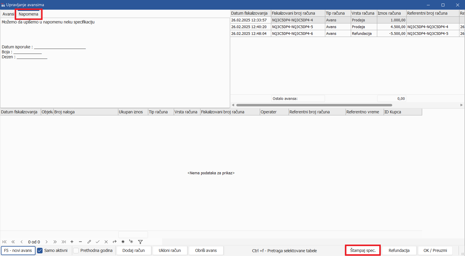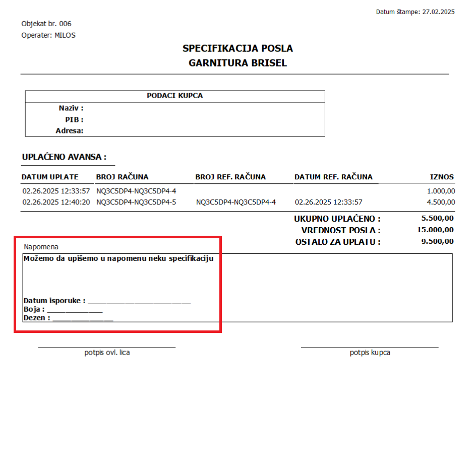 Unapređena je funkcija Upravljanja avansima u BizniSoft POS-u. Implementirana je nova kolona Vrednost posla u kojoj je omogućen unos ukupne vrednosti ugovorenog posla kao i nov tab Napomena koji služi korisniku za upis dodatnih informacija vezanih za konkretan posao. Nakon izdavanja jednog ili više pojedinačnih avansa, omogućena je štampa specifikacije svih informacija o realizovanim uplatama i dodatnim napomenama klikom na polje Štampaj specifikaciju:
