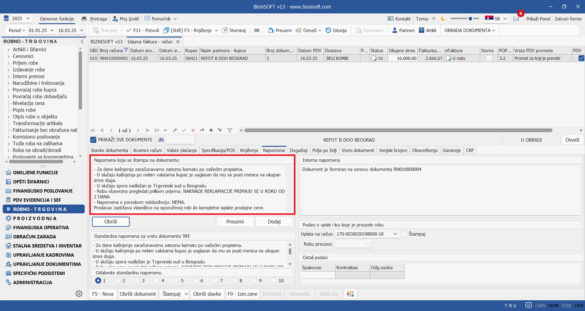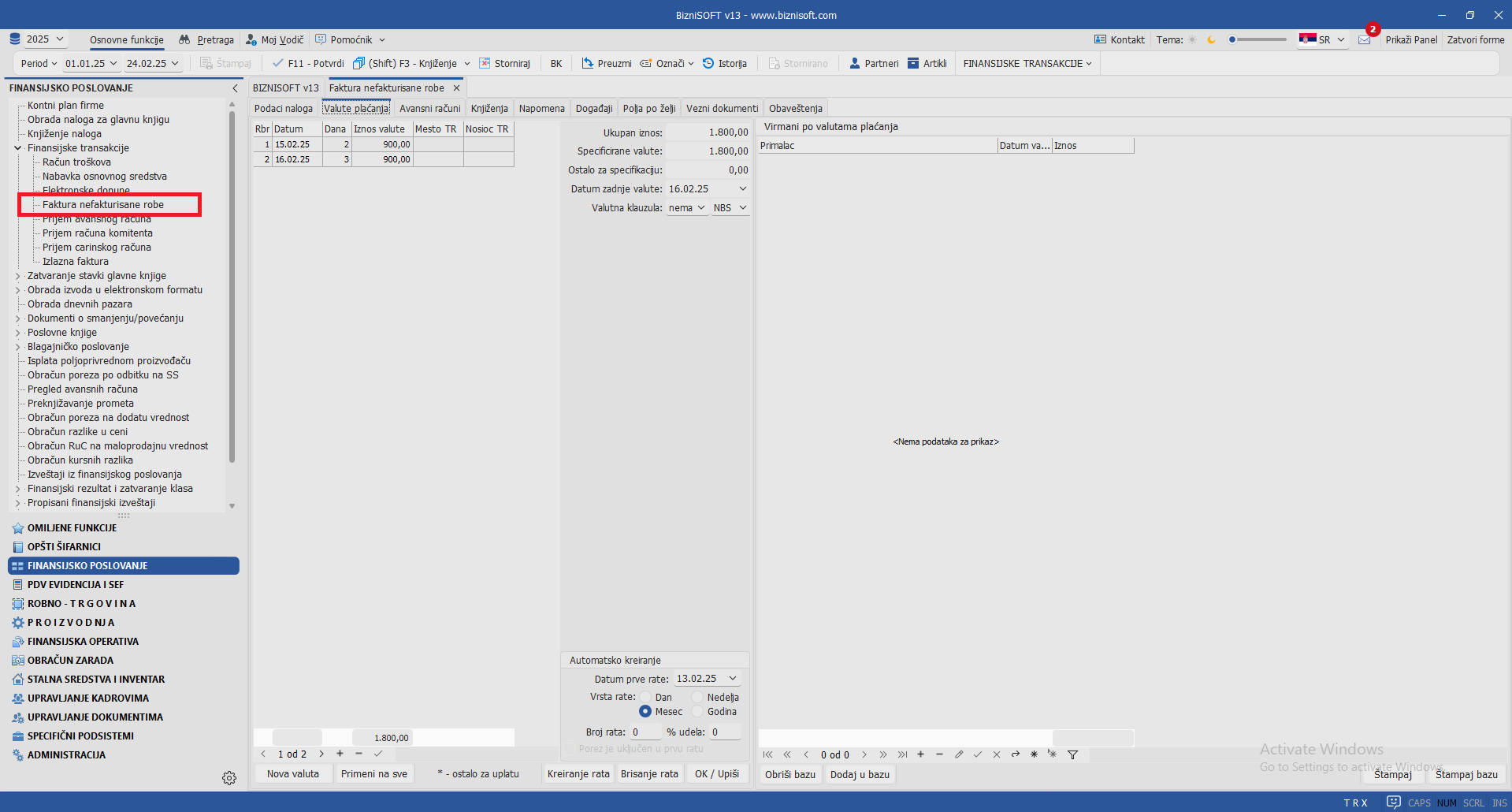 Omogućeno je ručno definisanje valuta plaćanja, kreiranja rata i dodatnih raspoloživih opcija u tabu Valute plaćanja za tip dokumenta Faktura nefakturisane robe: