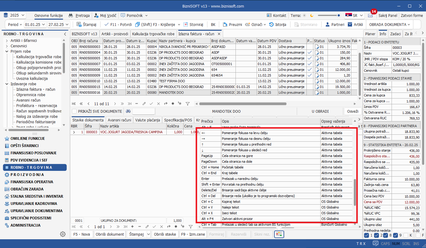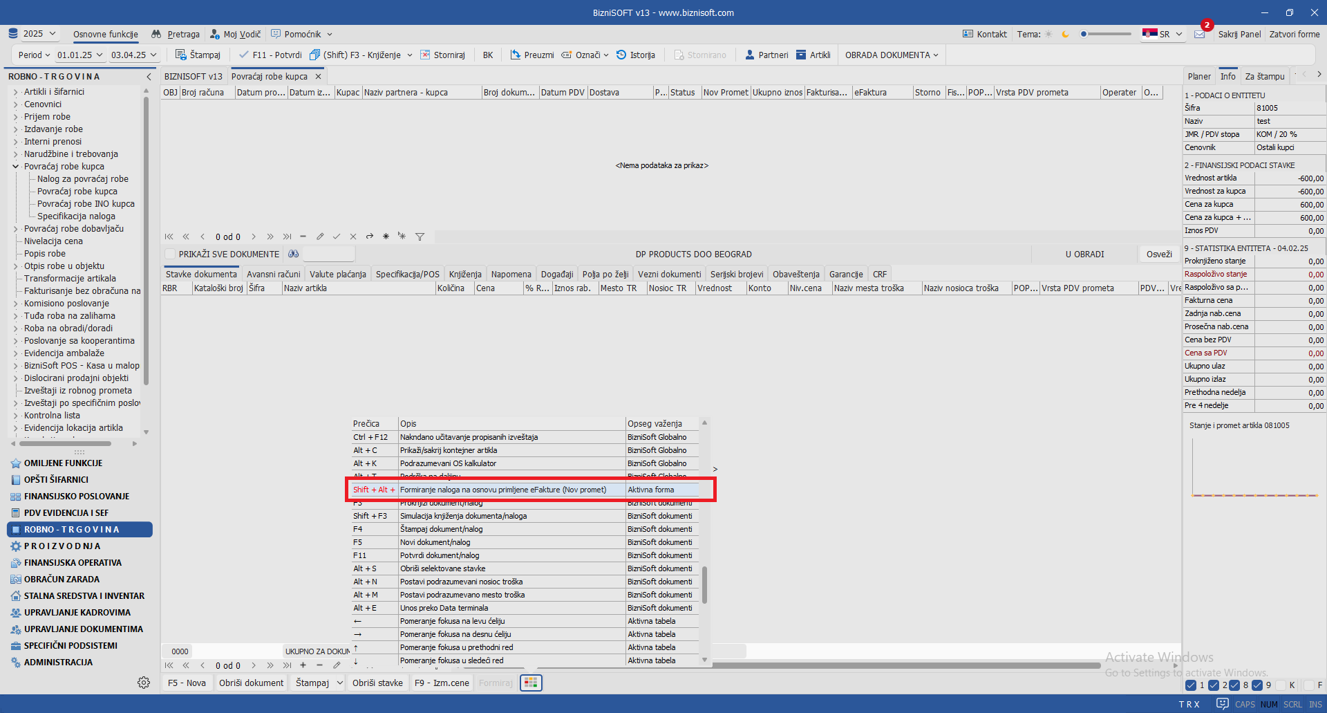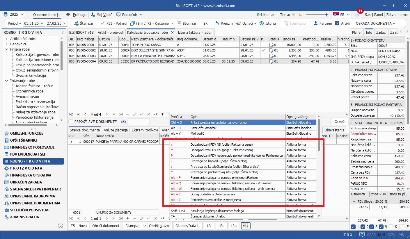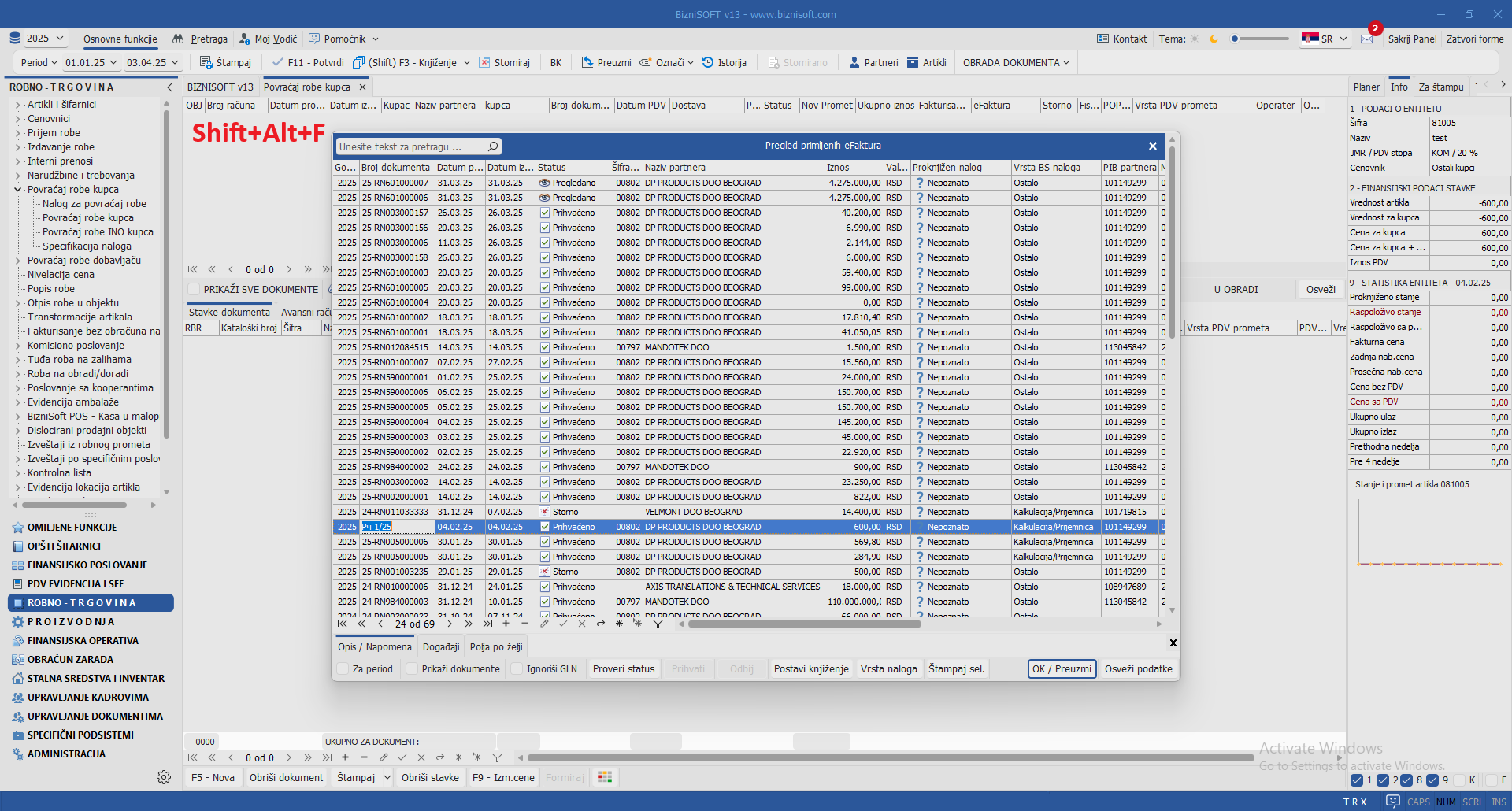 Uvedena je nova prečica u formi Povraćaj robe kupca Shift+Alt+F. Standardno, pomoću prečice ALT+F vrši se pokretanje Pregleda poslatih faktura i kreiranje dokumenta odobrenje na osnovu poslatog eOdobrenja. Analogno pomenutoj funkciji, kombinacijom tastera Shift+Alt+F pokrenuće se Pregled primljenih eFaktura i formirati odobrenje sa obeležjem Nov promet sa automatski popunjenim podacima za eFakture pod uslovom da u konfiguratoru nije aktiviran parametar 11034 – Formiranje povraćaja robe na osnovu eOdobrenja/FR – Šifra artikla za robu – opšta stopa: