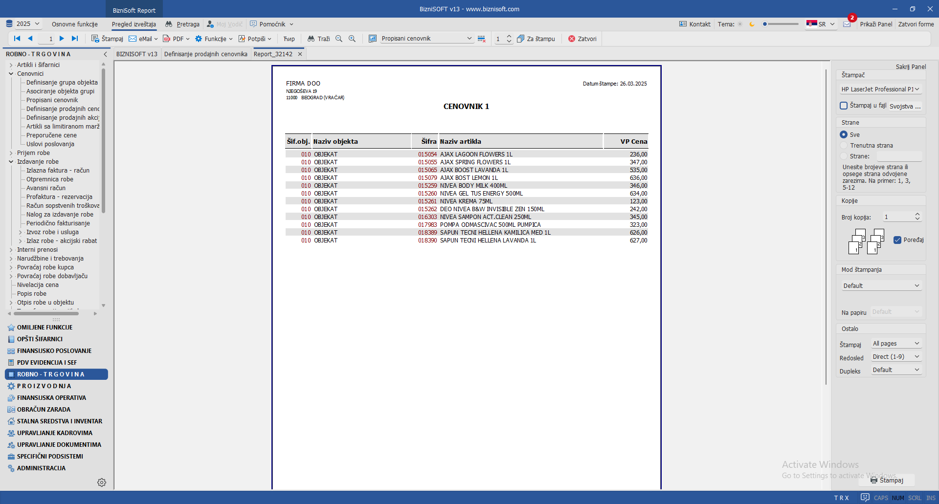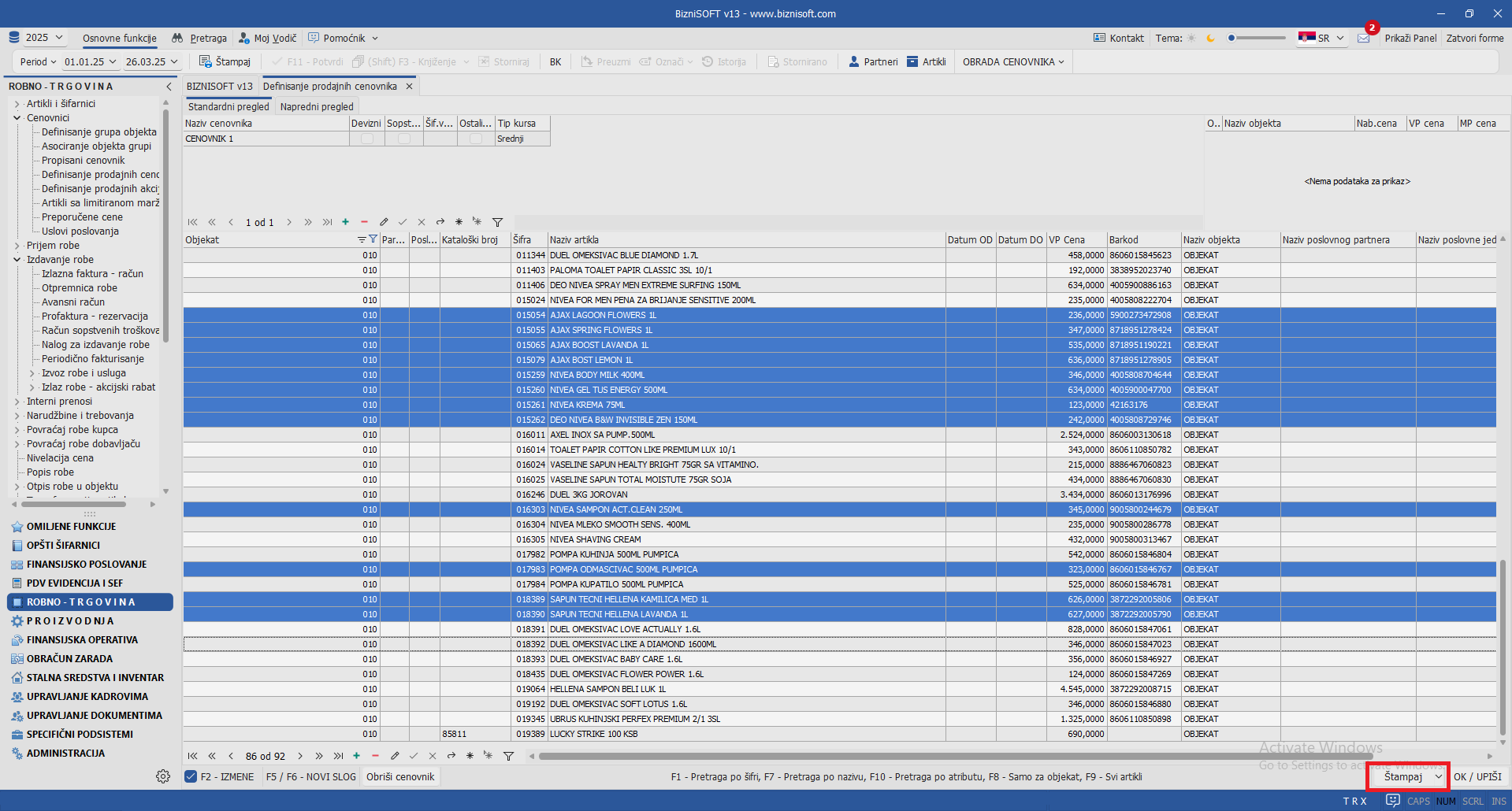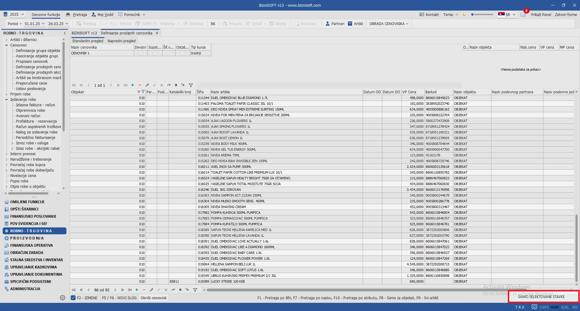 Implementirana je nova varijanta izveštaja za Samo selektovane stavke u formi Definisanje prodajnih cenovnika. Klikom na polje Štampaj i izborom opcije Samo selektovane stavke, program će kreirati izveštaj/cenovnik za sve artikle koji su selektovani (bilo putem filtriranja kolona ili pomoću prečice Ctrl+A ili CTRL/Shift+Click):