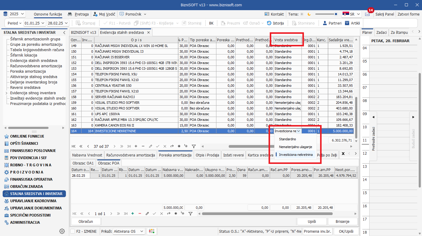 U evidenciji stalnih sredstava omogućen je unos Investicionih nekretnina tako što je u polju Vrsta sredstva dodato novo obeležje Investicione nekretnine. Ukoliko je to polje čekirano, program će formirati poresku amortizaciju – POA Obrazac, bez obzira što nema obračuna računovodstvene amortizacije: