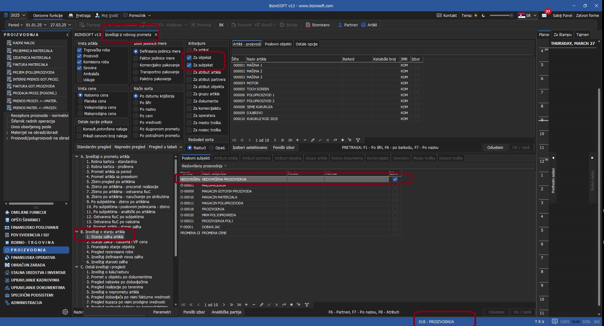 Stanje zaliha nedovršene proizvodnje dobija se u Izveštajima iz robnog prometa, štikliranjem opcija Za subjekat – Nedovršena proizvodnja i Za objekat – Proizvodnja: