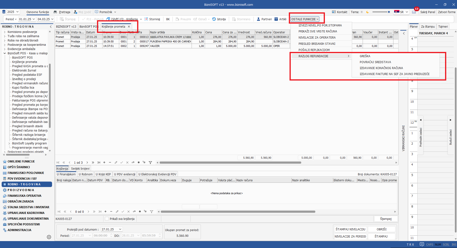 Za račune tipa refundacija koji su izdati u starijim verzijama ili iz bilo kog razloga nije upisan razlog refundacije, knjiženje kasa prometa neće biti moguće (program će javiti adekvatnu grešku), pa je iz tog razloga u formi Knjiženje prometa uvedena opcija Razlog refundacije u meniju Ostale funkcije tako da je pre knjiženja potrebno odabrati razlog refundacije za sve račune tipa promet refundacija uz napomenu da je pre konačnog knjiženja prometa omogućena promena razloga refundacije više puta: