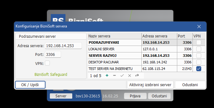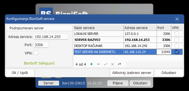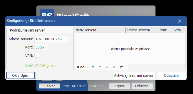 Ukoliko u momentu startovanja operater nije siguran koji server koristi, sada ima mogućnost da jednostavno klikne na dugme Server a zatim Odustani za zatvaranje forme sa podacima servera bez potrebe da restratuje aplikaciju.