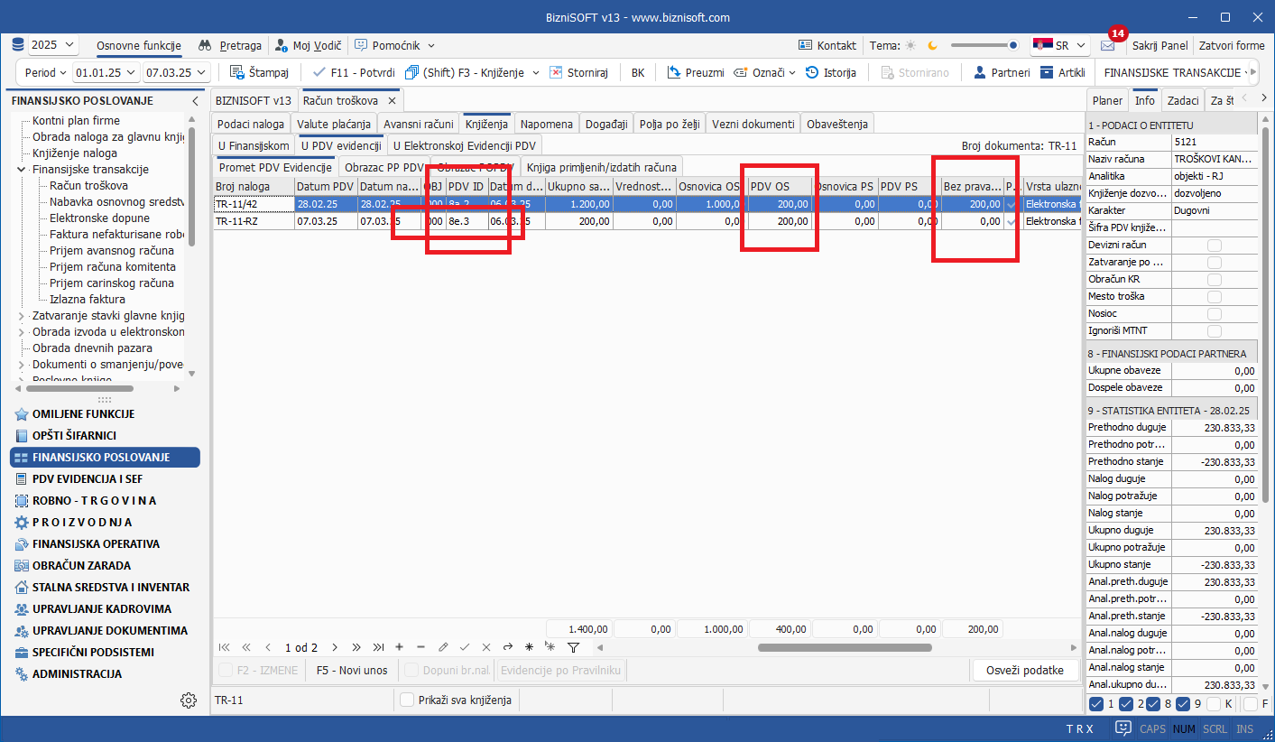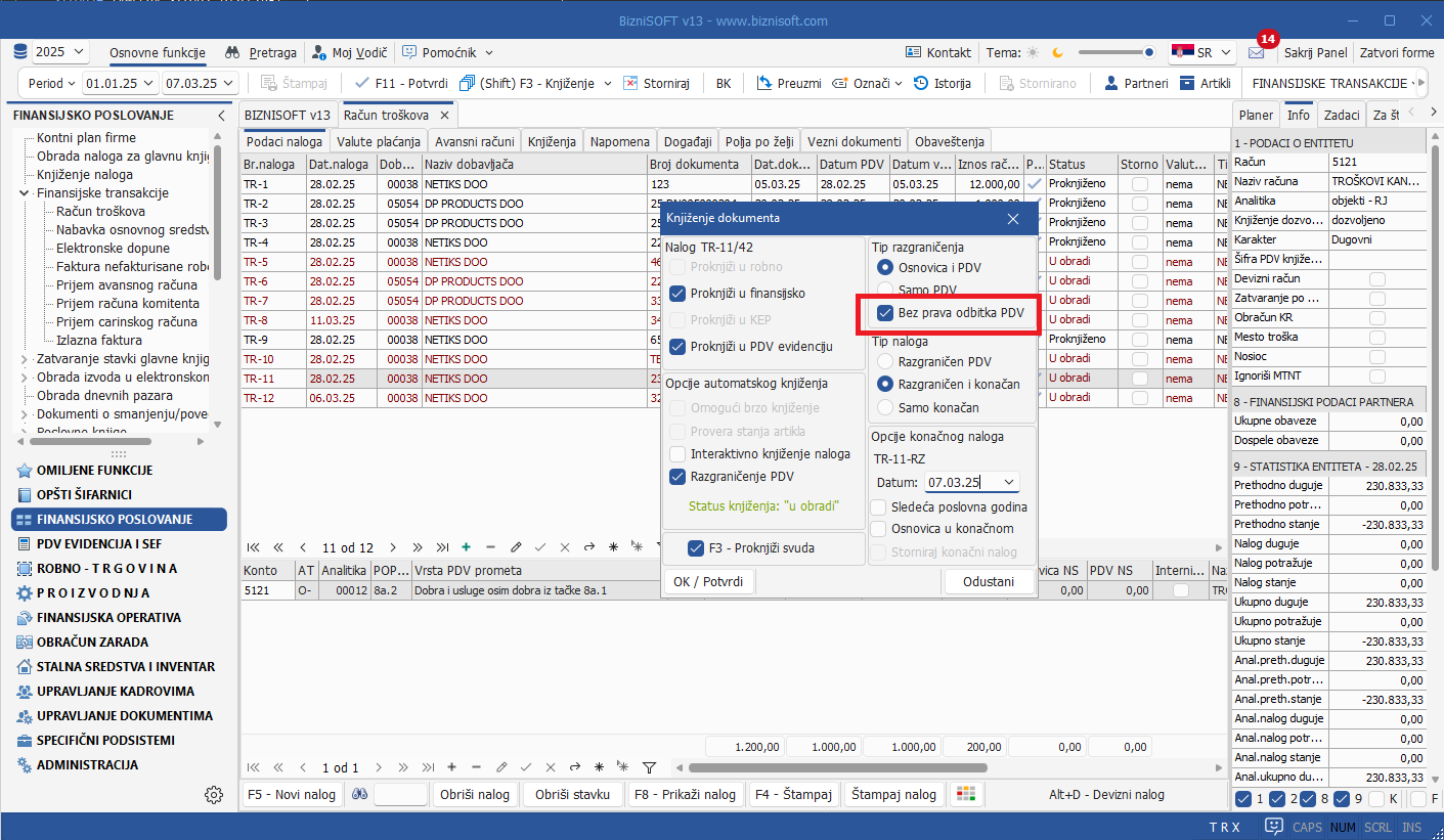 Implementirana je nova, dodatna opcija u formi razgraničenja pod nazivom Bez prava odbitka PDV koja se koristi u uslovima kada postoji pravo odbitka PDV, ali ne u tekućem periodu i želimo da u narednom periodu proknjžimo na poziciju 8e.3 POPDV obrasca (primer: eFaktura prihvaćena posle 10-og u mesecu). Ova opcija će se konsultovati samo ukoliko je čekiran tip razgraničenja Osnovica i PDV i tip naloga Razgraničen i konačan: