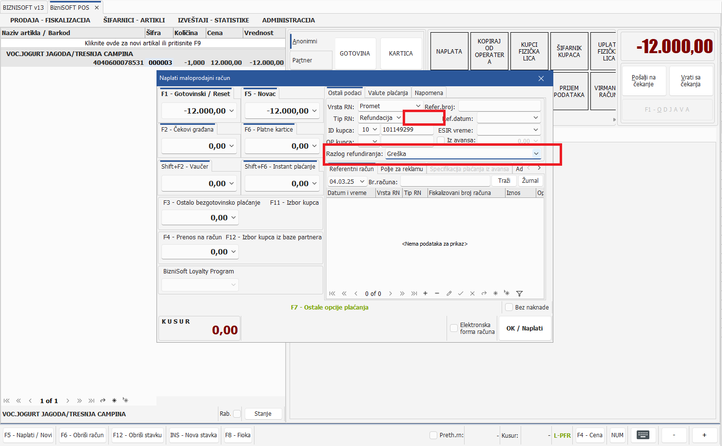 U novijim postavkama verzije unapređena je procedura refundacije fiskalnih računa. U prethodnim verzijama, postojale su dve opcije: refundacija ili greška, što nije dovoljno u uslovima knjiženja refundacije fiskalnog računa u EE PDV. Iz tog razloga, izbačena je opcija Greška u formi naplate i zamenjena novom opcijom Razlog refundiranja koja će biti vidljiva samo u slučaju izdavanja tipa računa refundacija: