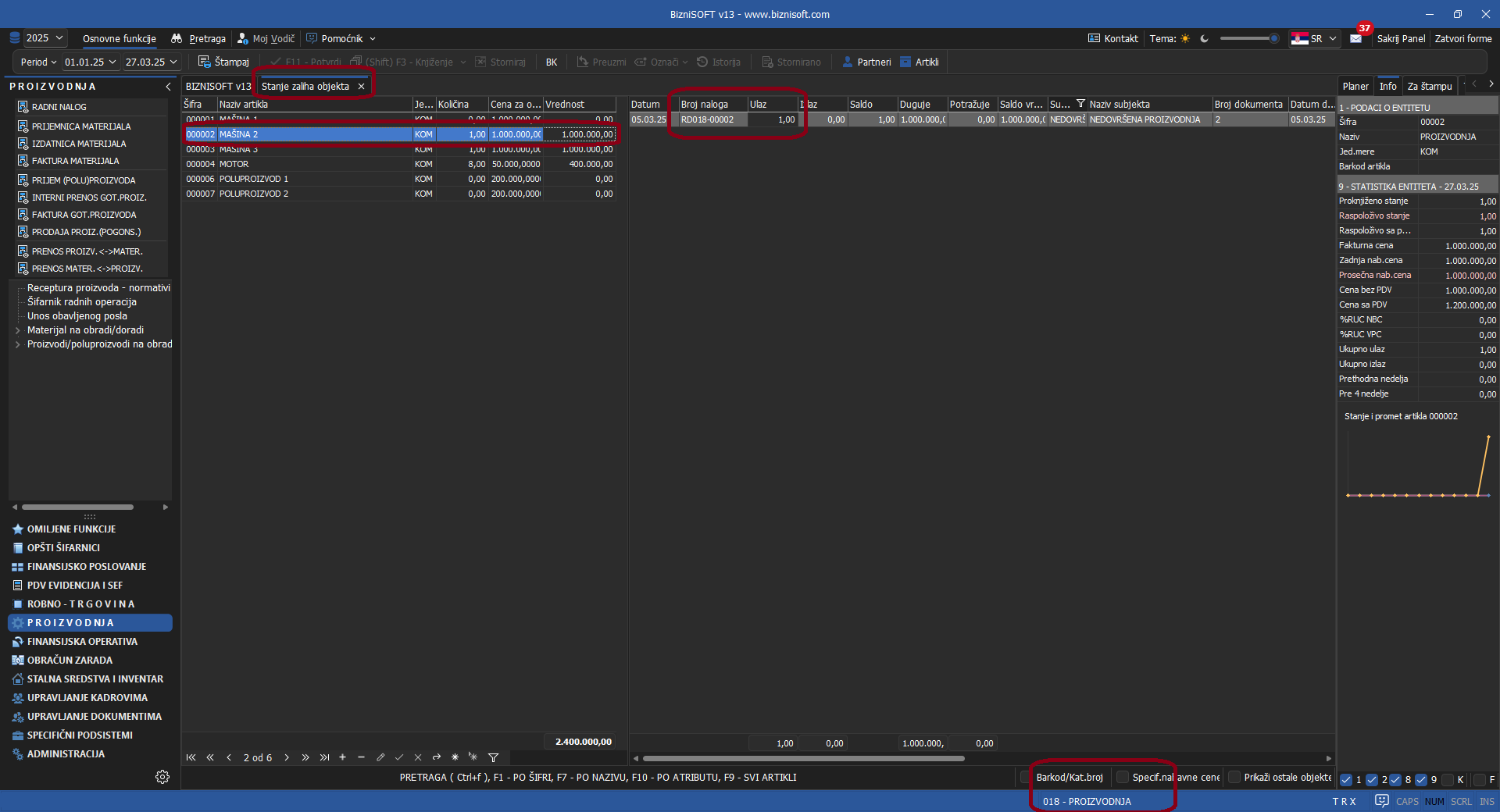 Omogućeno je knjiženje ulaza proizvoda i poluproizvoda u robnoj evidenciji u objektu Tip 18 Proizvodna jedinica klikom na komandu Raspiši radni nalog da bi u izveštajima iz robnog dobili stanje zaliha nedovršene proizvodnje: