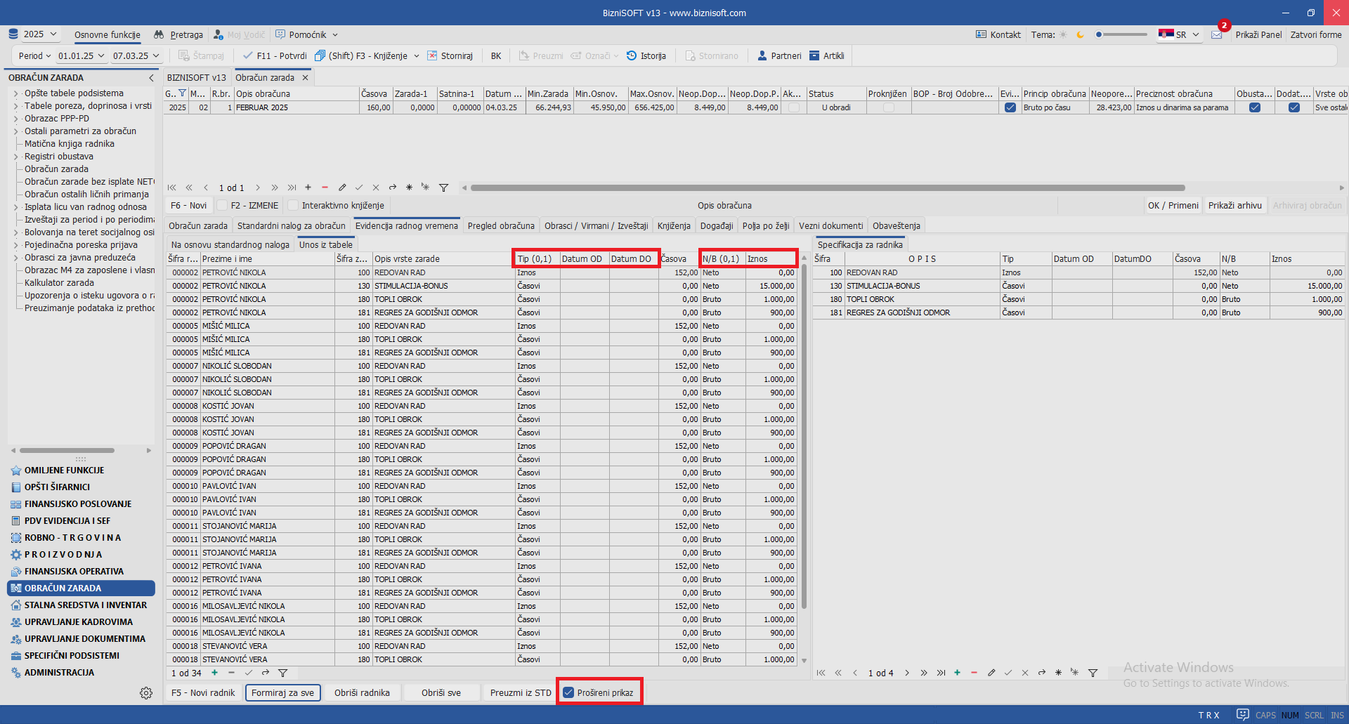 Aktivacijom polja Proširen prikaz u tabu Unos iz tabele omogućen je prikaz dodatnih kolona prilikom startovanja procedure uvoza podataka iz XSLX fajla za radnike koji imaju dodatne podatke za vrste zarada koje nemaju časove (iznos za topli obrok, regres itd):