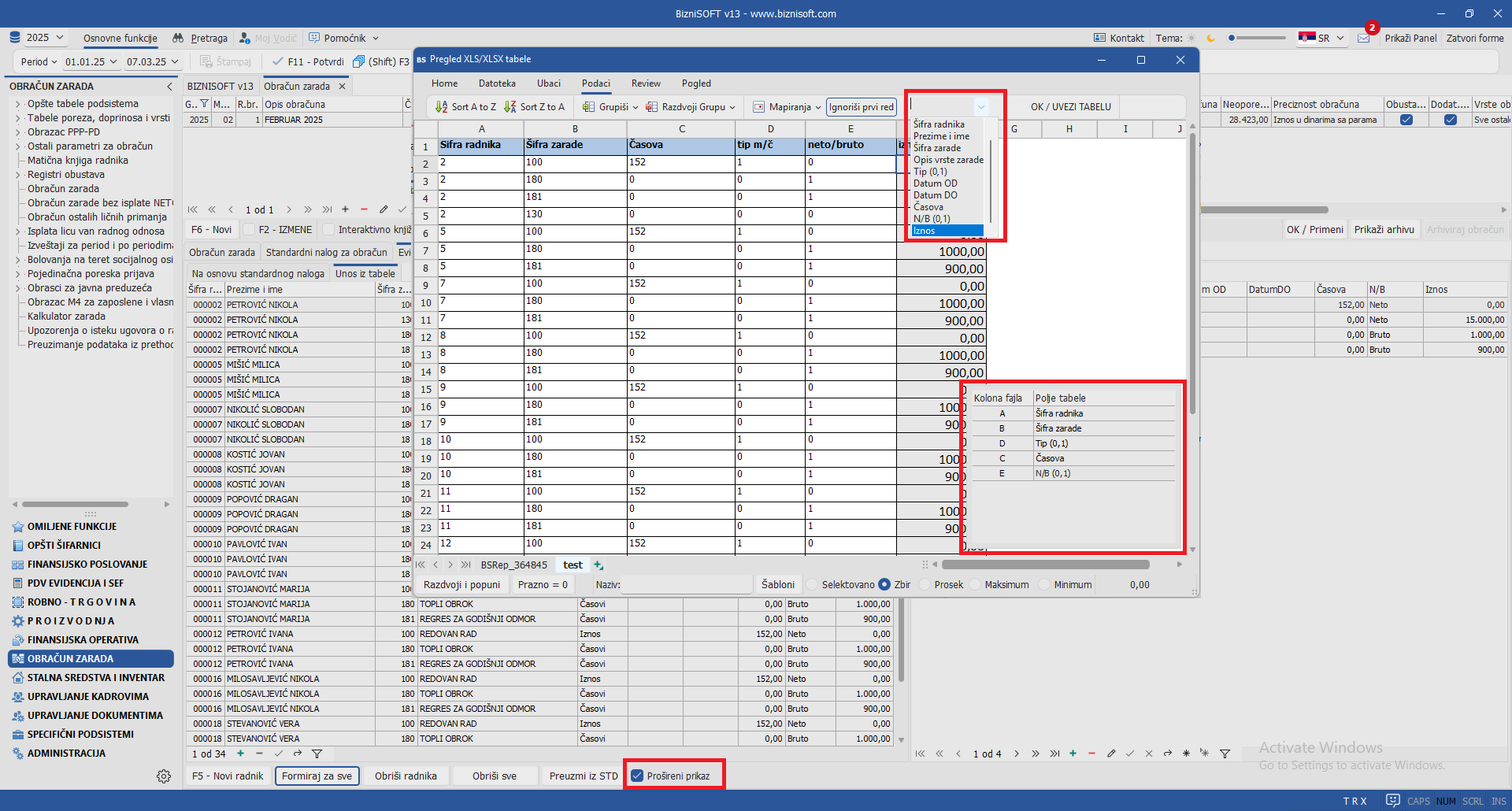 Adekvatnim postupkom mapiranja kolona podataka izvršiće se uvoz svih potrebnih podataka iz fajla i prikaz u delu Specifikacija za radnika. Ukoliko je u formi obračuna, aktivirano polje Evidencija RV, obeležje Evidencija radnog vremena će imati prioritet u odnosu na postavke Standardnog naloga za obračun i obrnuto – ukoliko za za obračun postoji popunjen standardni nalog, a za šifru radnika ne postoje podaci u Excel fajlu, program će isključivo konsultovati postavke standardnog naloga: