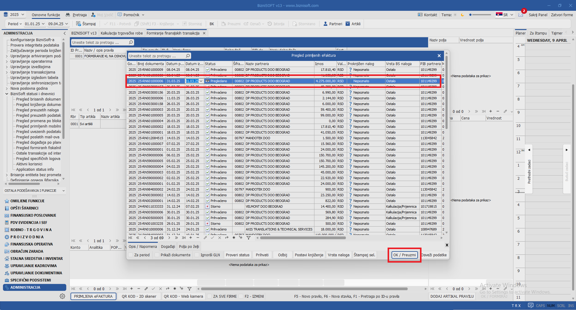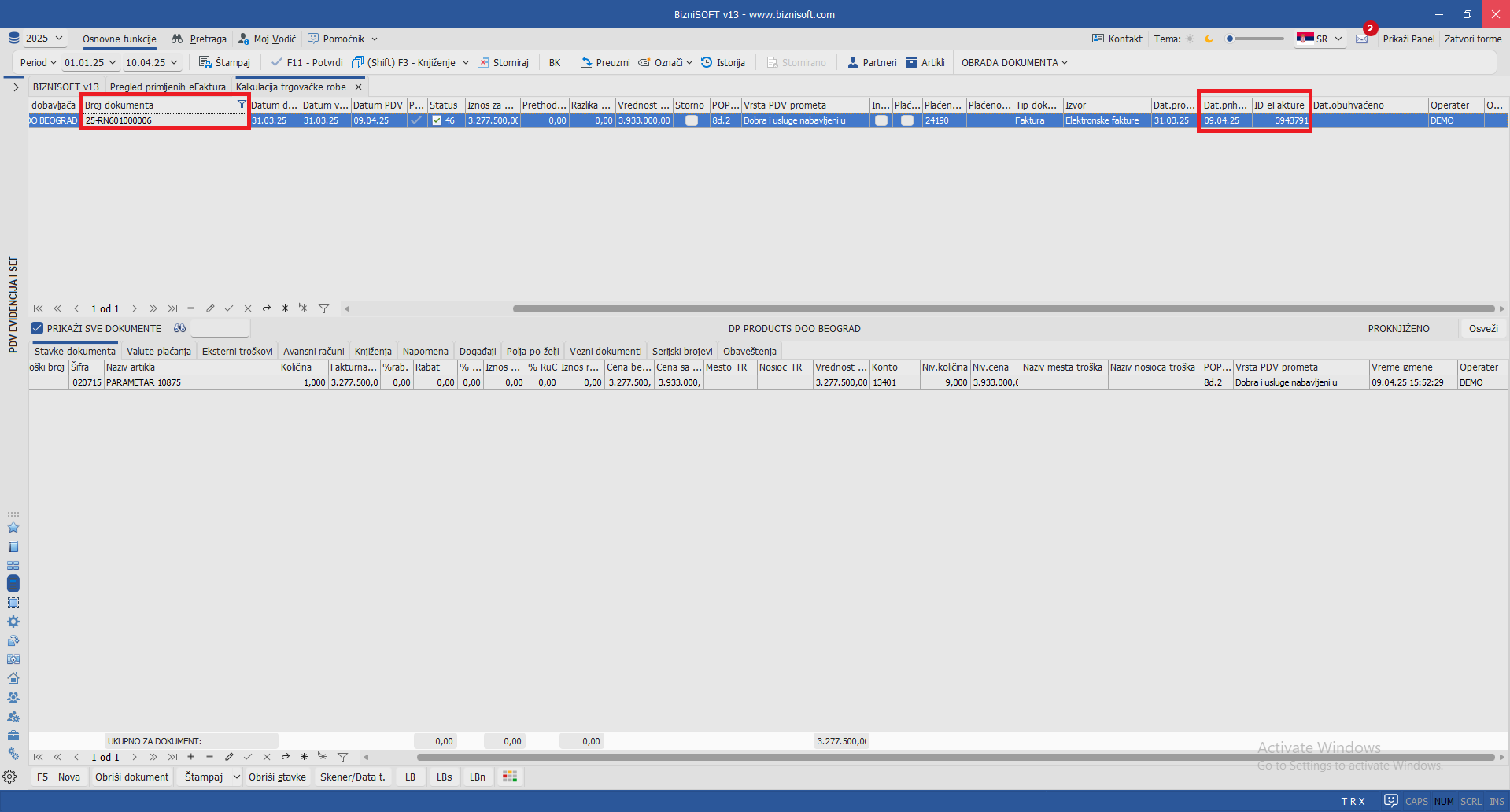 Implementiran je parametar 11072 – Prihvati primljenu eFakturu prilikom potvrde formiranog ulaznog računa kojim je omogućeno automatsko prihvatanje eFakture i upis datuma prihvatanja prilikom (prvog) potvrđivanja dokumenta ukoliko je prethodno aktiviran parametar 10870 – Omogući izbor primljenih i pregledanih eFaktura prilikom formiranja kalkulacija i/ili računa troška. Prilikom formiranja kalkulacije na osnovu primljene eFakture, program će omogućiti prikaz u Pregledu primljenih eFaktura sa statusom Pregledano a zatim će prilikom potvrde kalkulacije pomoću komande F11 – Potvrdi program automatski prihvatiti eFakturu: