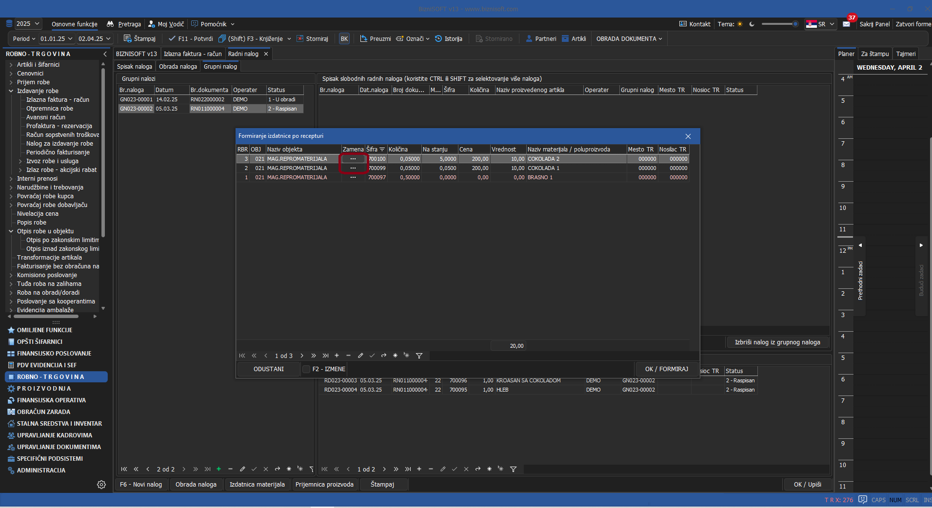 Unapređena je procedura Zamene artikla u funkciji Formiranje izdatnice po recepturi u Radnom nalogu. Ukoliko nekog artikla nema dovoljno na stanju, a njegova zamena je definisana na više artikala, program će prvo proveriti da li postoji potrebna količina na originalnoj šifri (po recepturi) i da razliku u količini preuzme sa druge šifre zamenskog artikla. Procedura traženja zamenskog artikla je sledeća: