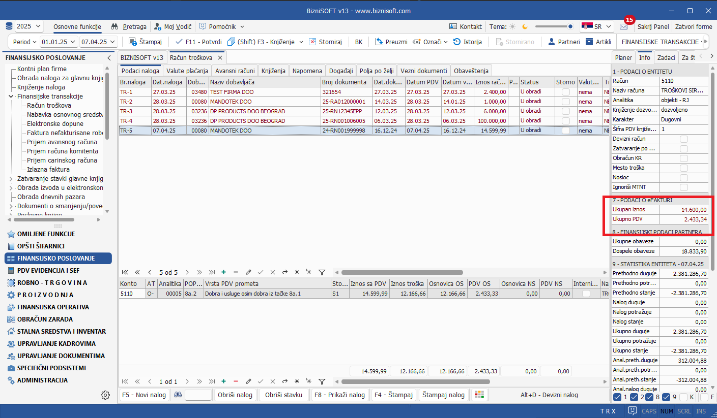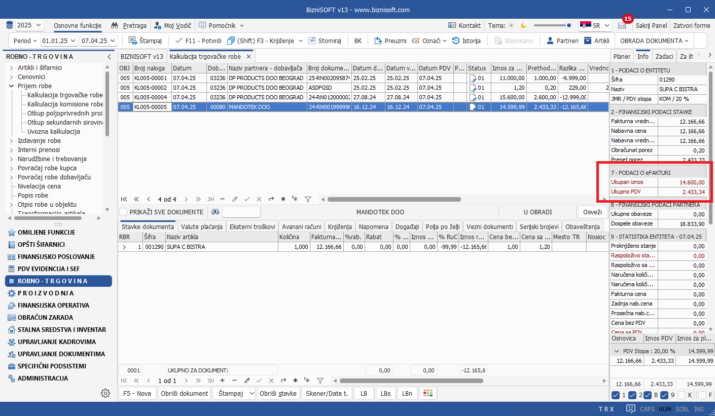 Omogućen je prikaz Iznosa sa eFakture – Ukupan iznos i ukupan PDV u Info panelu ukoliko su kalkulacija i/ili Finansijske transakcije kreirani na osnovu primljene eFakture:
