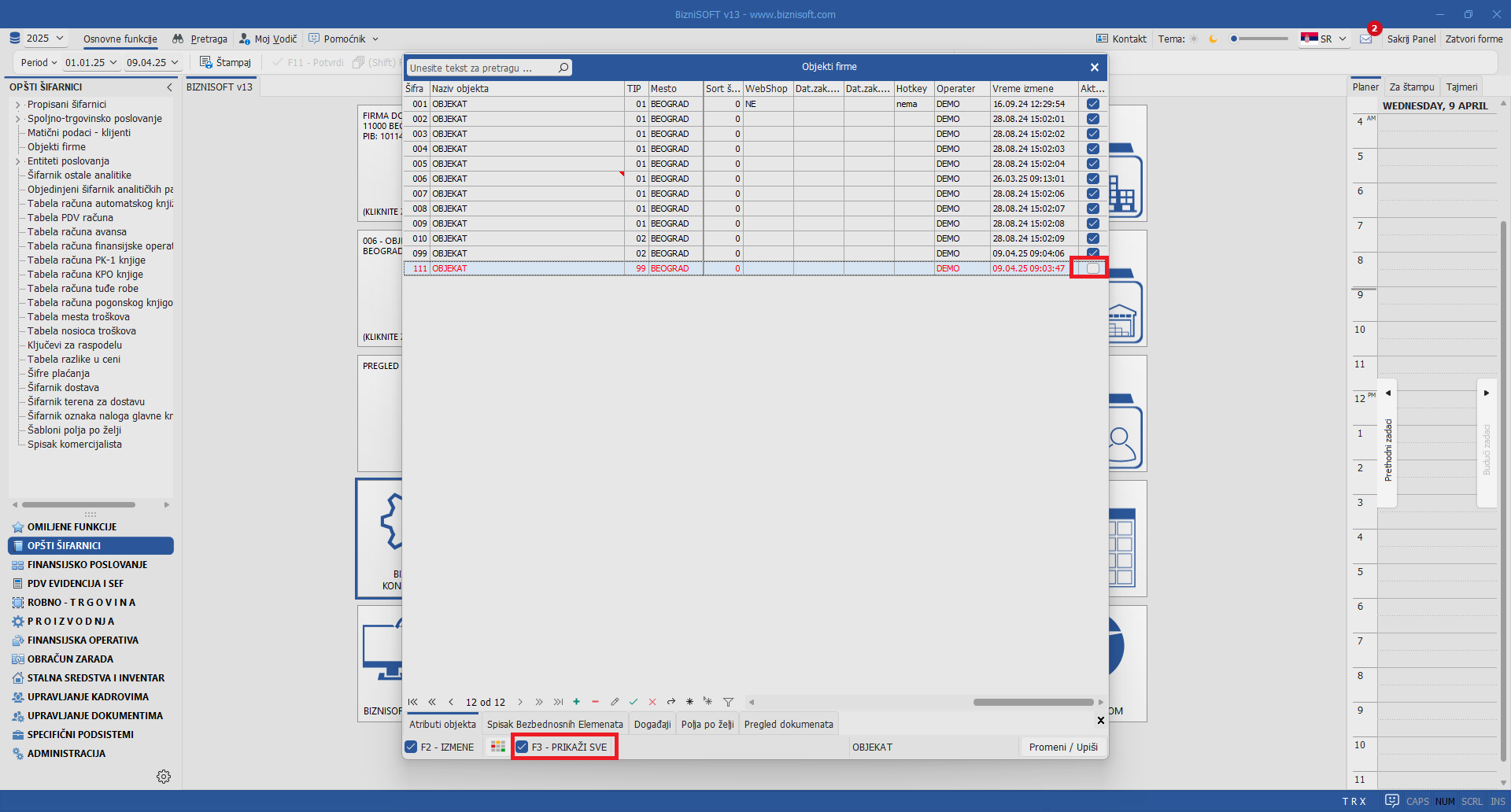 U Šifarniku objekata implementiran je nov checkbox Aktivan (analogno srodnoj funkcionalnosti u šifarniku partnera) koji je podrazumevano čekiran za sve objekte firme a ukoliko je za konkretan objekat polje Aktivan odčekirano, slog će se prikazati u crvenoj boji. Neaktivni objekti se standardno ne prikazuju. Prikaz svih neaktivnih objekata omogućen je pokretanjem opcije F3 – Prikaži sve: