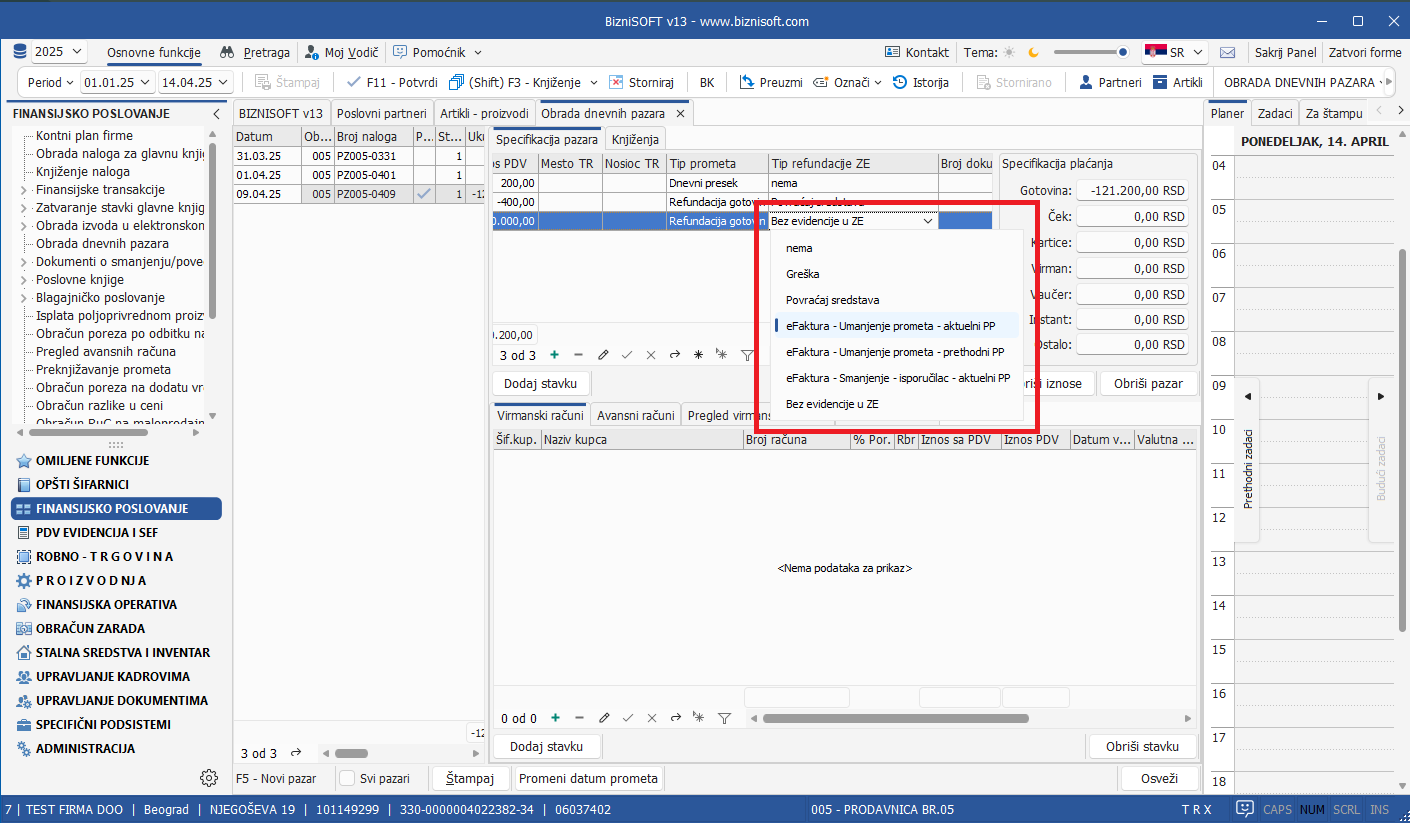 Funkcija Obrada dnevnih pazara usklađena je sa kasa prometom uvođenjem novih polja: Tip refundacije, Broj refundiranog FI i Datum refundiranog FI: