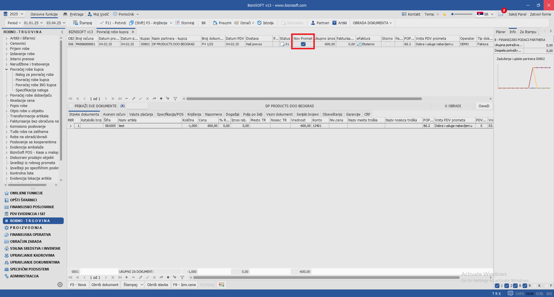Povraćaj sredstava: ide na vrstu prometa Smanjenje osnovice/PDV isporučilac za vrstu računa promet ili Smanjenje osnovice/PDV isporučilac po osnovu avansa za vrstu računa Avans; u PDV evidenciji ide na popdvid 3.6 za obe vrste računa.