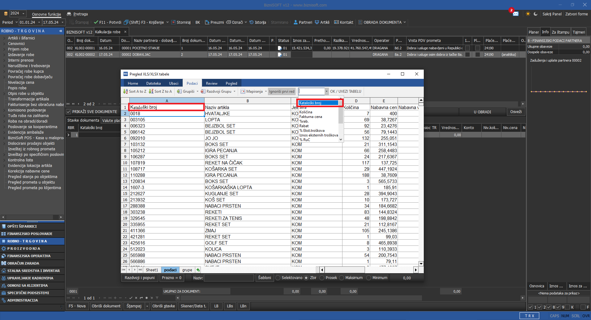 Omogućen je izbor opcije Kataloški broj u mapiranjima za uvoz kataloških brojeva iz Excel fajla u formama predračuna, računa, kalkulacija, uvoznih kalkulacija, nivelacija i nasleđenih formi pod uslovom da je prethodno aktiviran parametar 10194 – Prikaži kataloški broj u obradi dokumenta. Opcija uvoza kataloškog broja primenjiva je i u formi Definisanje prodajnih cenovnika: