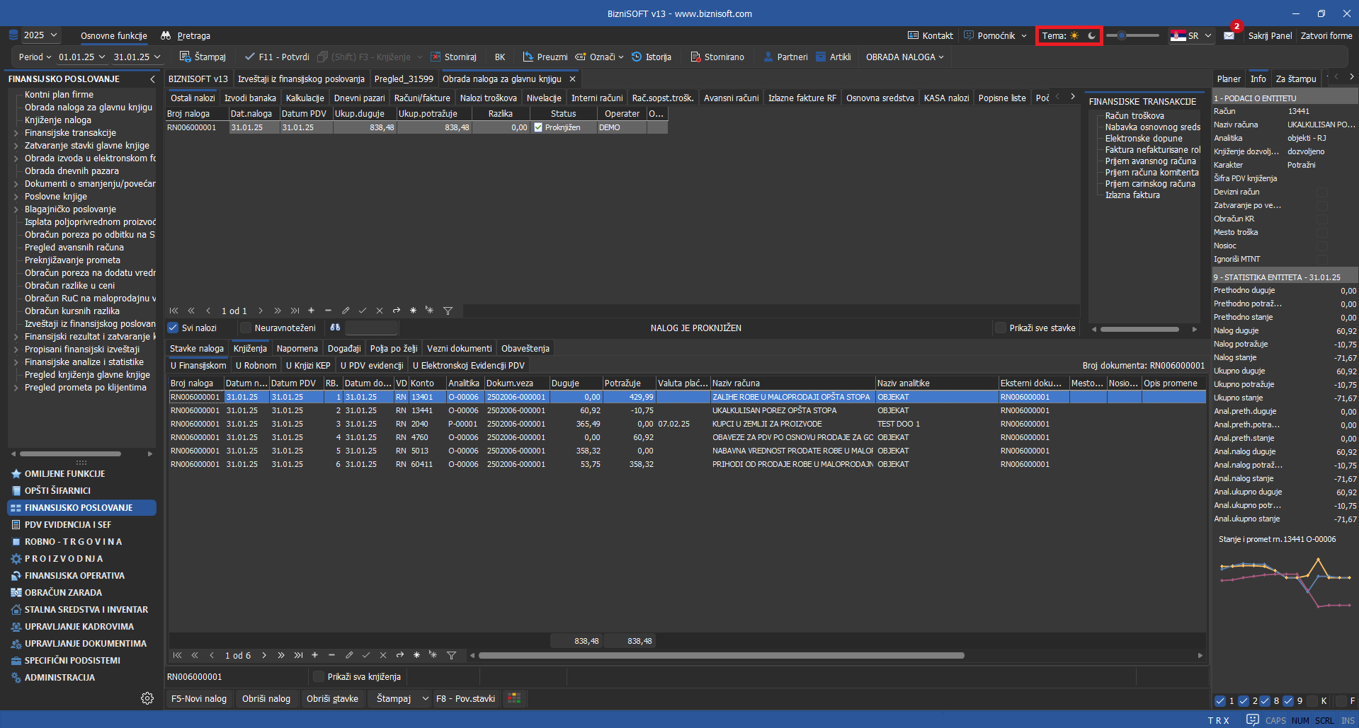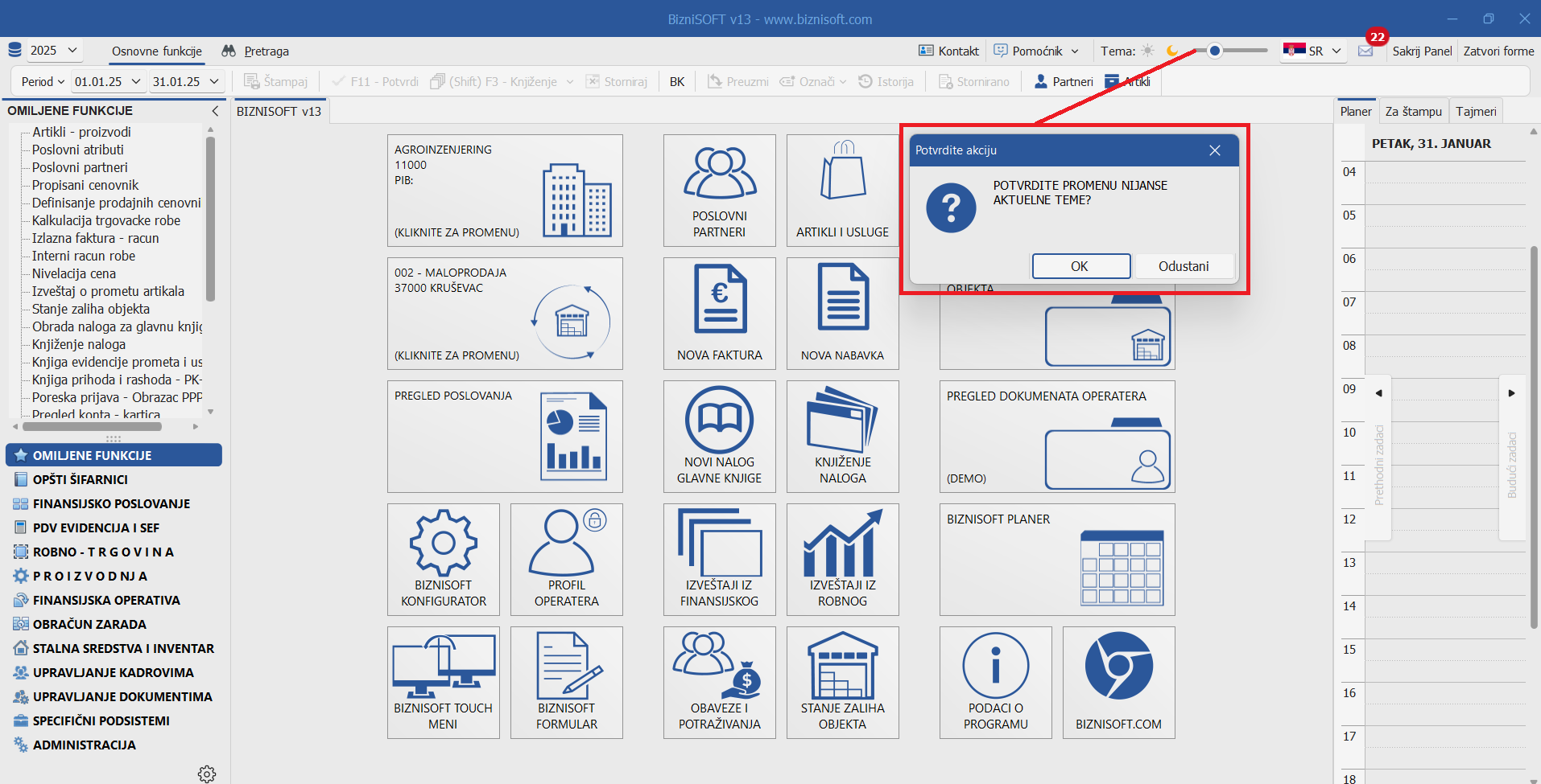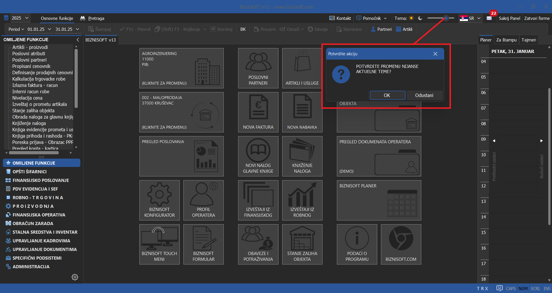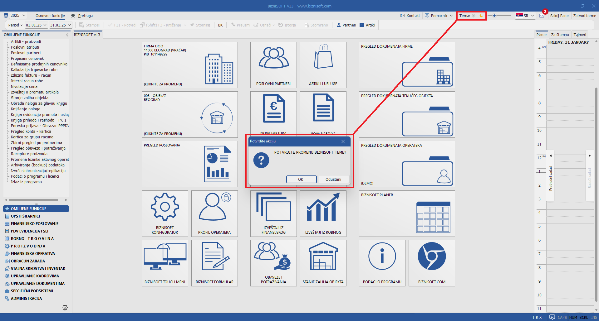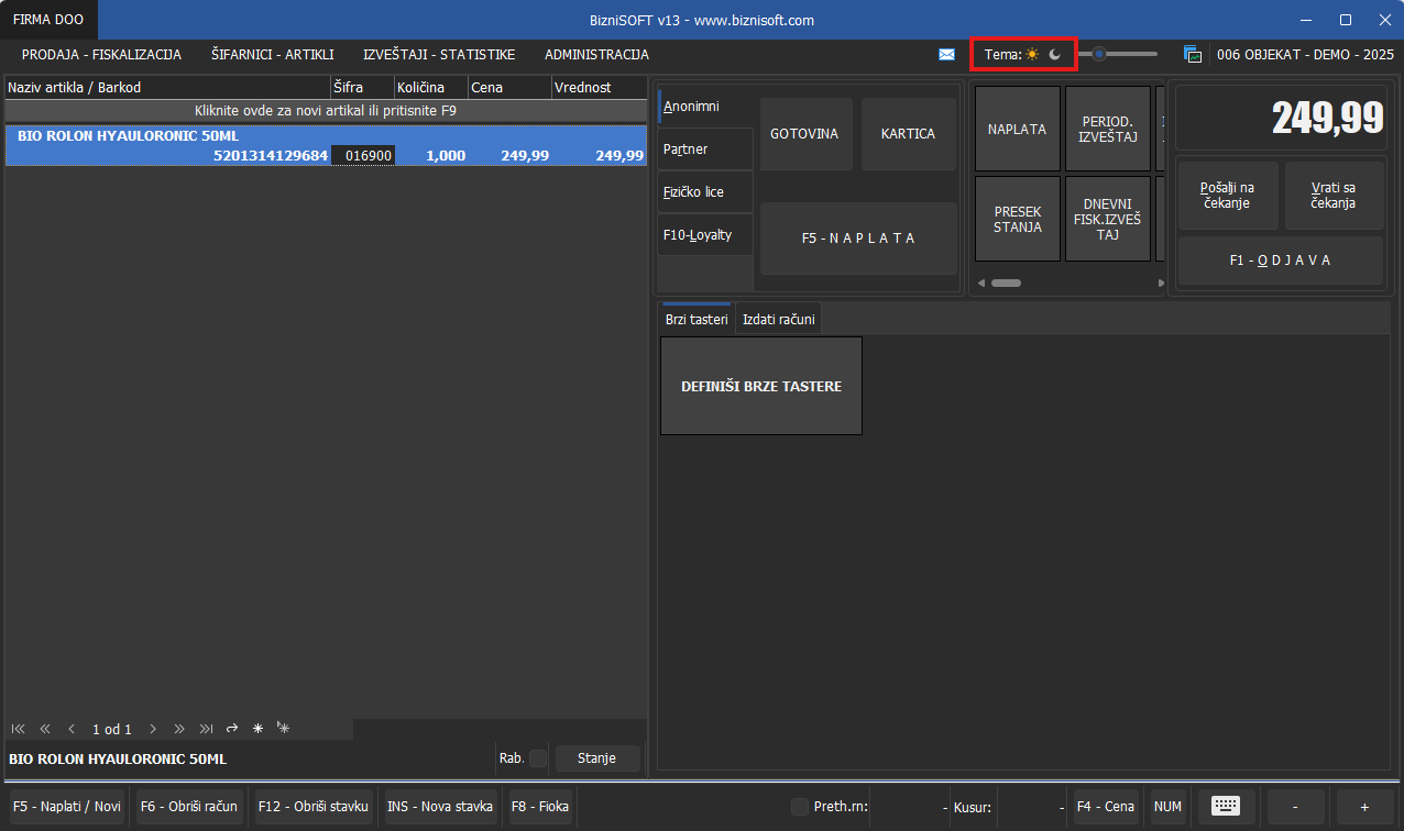 Izgled tamne teme iz verzije 12 je potpuno promenjen. U verziji 13 omogućena je promena teme u realnom vremenu jednostavnim klikom na neki od ponuđenih simbola u zaglavlju BizniSoft-a i BizniSoft POS-a, bez potrebe za restartovanjem programa: