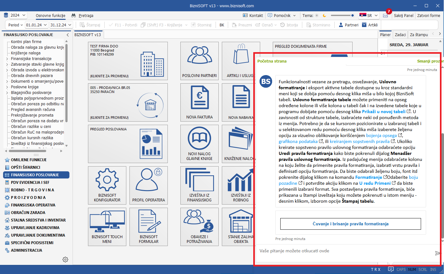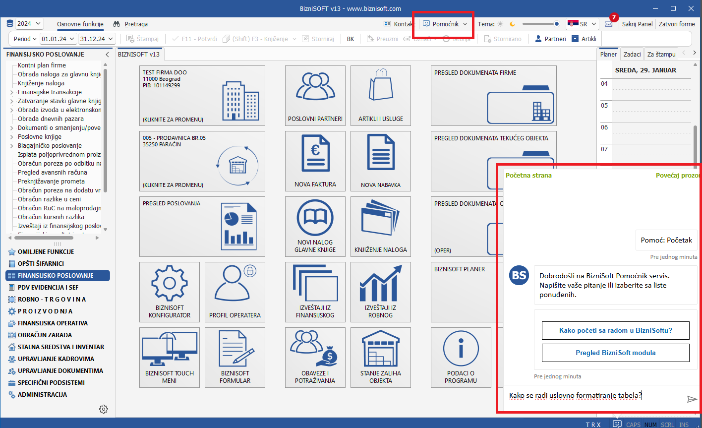 Implementiran je AI ChatBot pod nazivom BizniSoft Pomoćnik (Alt+B), baza znanja koja sadrži preko 400 članaka sa ciljem da korisnicima pruži dodatna pojašnjenja vezana za funkcije programa na osnovu postavljenog pitanja i pruži sugestiju u tumačenju sistemskih poruka i instrukcija koje generiše BizniSoft:
