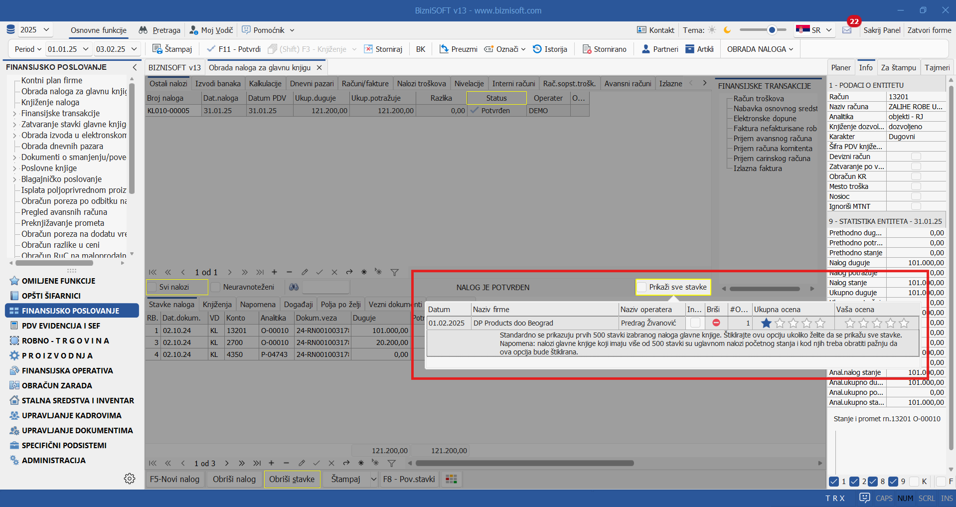 Implementiran je nov konfiguracioni parametar 11054 – Izvrši proveru neproknjiženih naloga prilikom izlaska iz programa. Ovaj parametar možete uključiti ukoliko želite da se izvrši provera da li su svi nalozi u finansijskom proknjiženi nakon izlaska iz programa (promene firme i/ili poslovne godine) uz napomenu da ova procedura ne vrši proveru finansijskih naloga koji su u statusu U obradi: