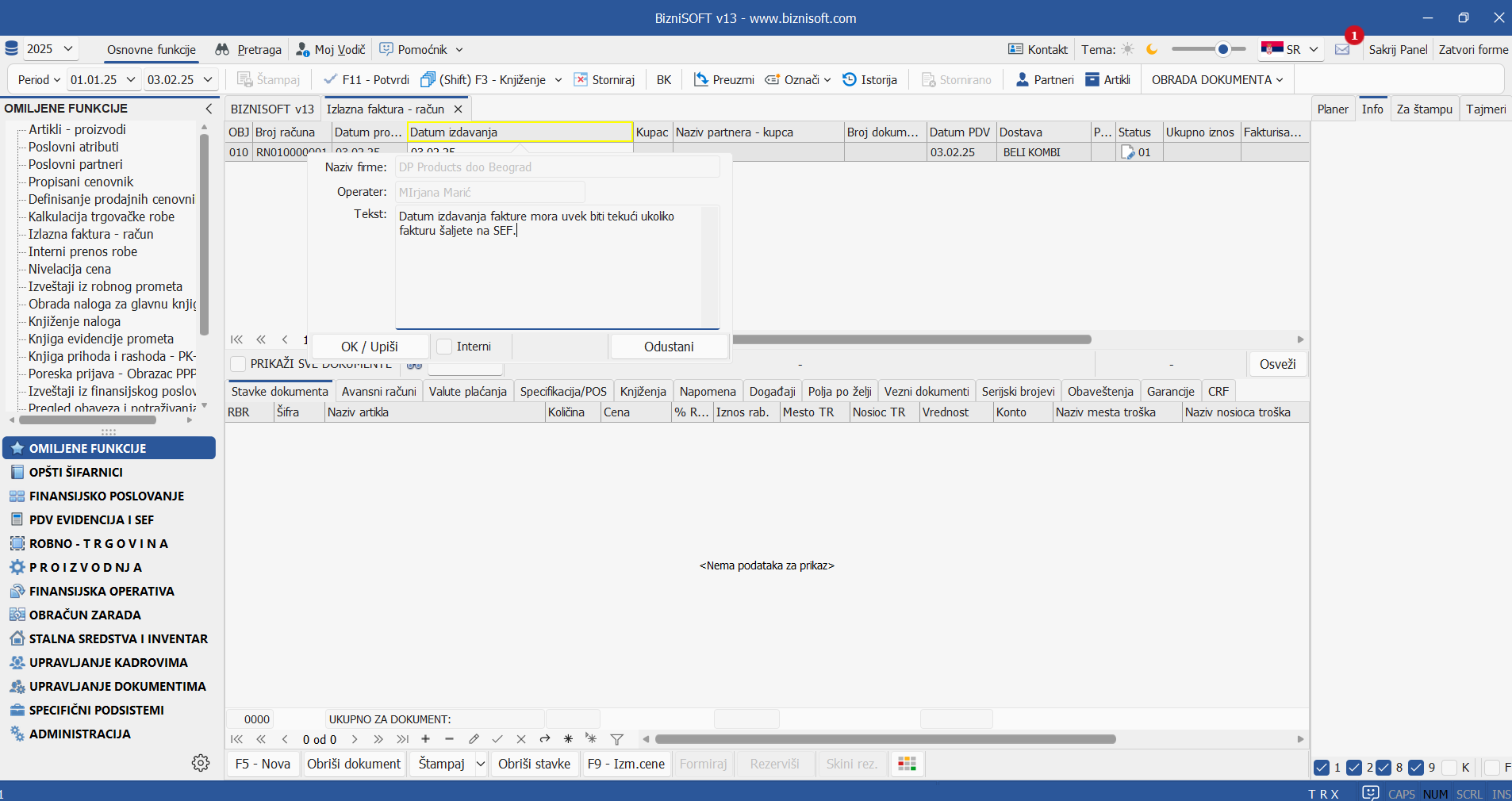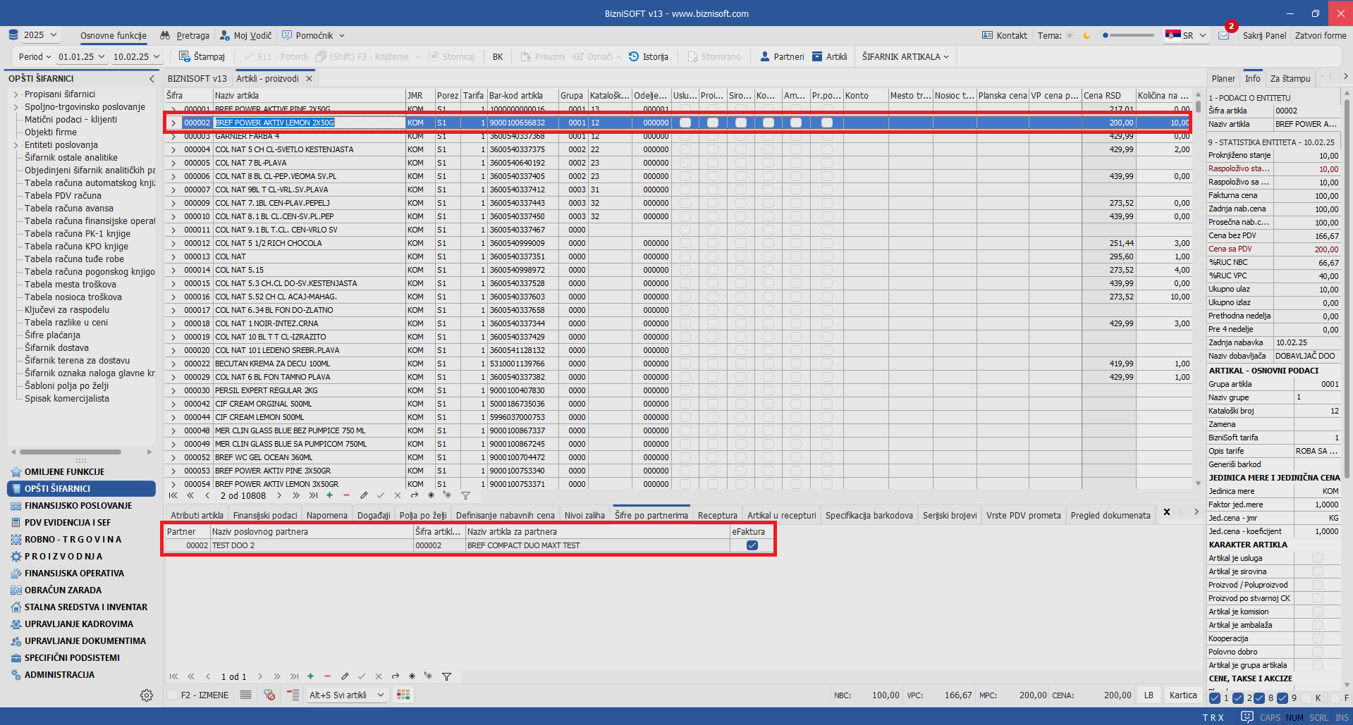 Implementirana su nova polja Naziv artikla za partnera i eFaktura u tabu Šifre po partnerima u Šifarniku artikala. Time je omogućeno da kupac primi fakturu sa izmenjenim nazivom artikla u odnosu na naziv artikla u BizniSoftu: polje eFaktura označava da će se prilikom formiranja eFakture konsultovati nov naziv artikla: