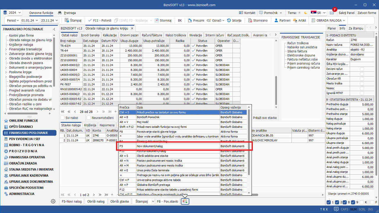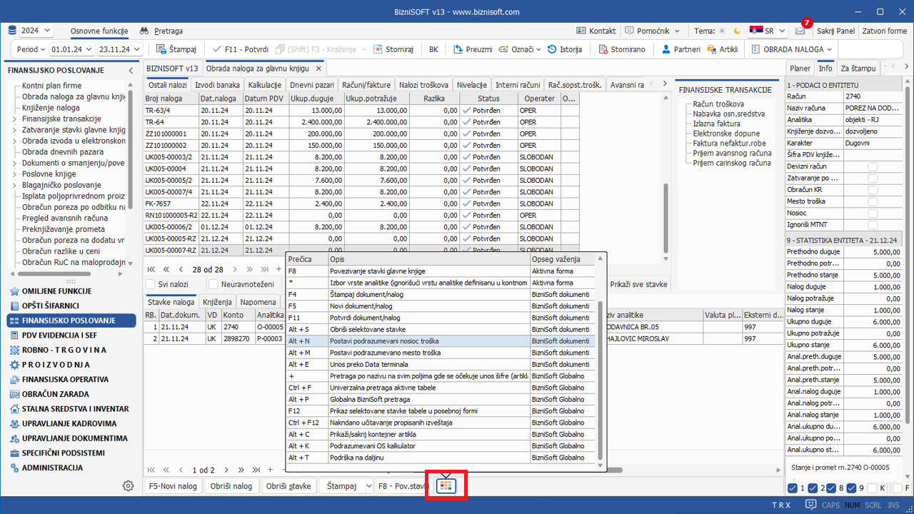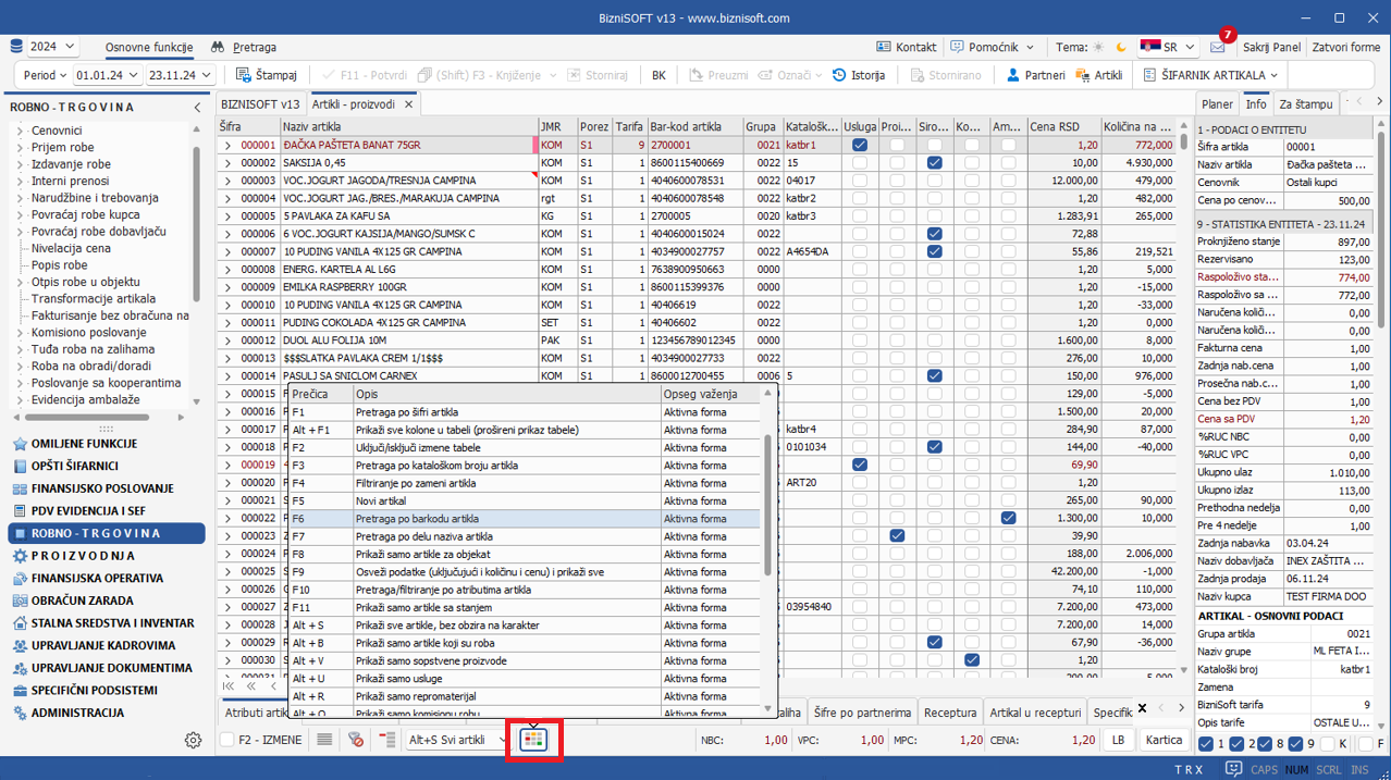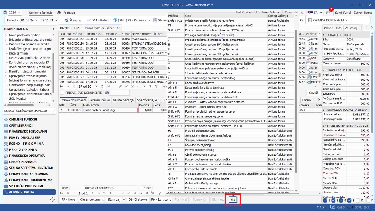 Budući da BizniSoft raspolaže velikim brojem tasterskih prečica koje su aktivne u BizniSoft formama, u Verziji 13 je implementirana mogućnost prikaza ovih prečica u većini formi u kojima postoje. Klikom na selektovanu stavku u tabeli prikaza prečica, izvršiće se aktivacija izabrane funkcije: