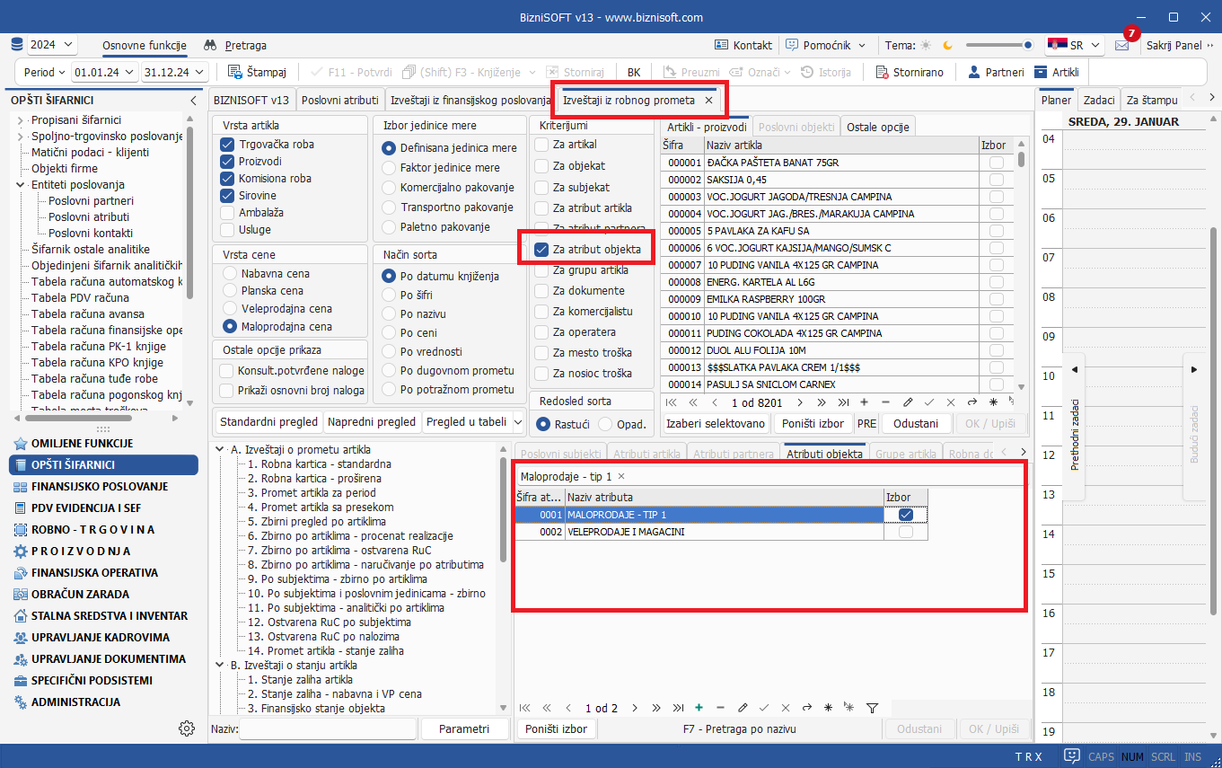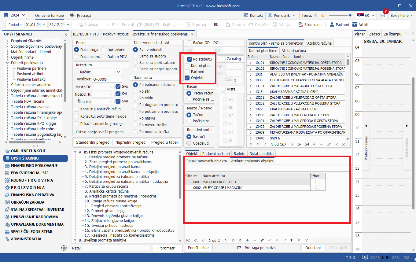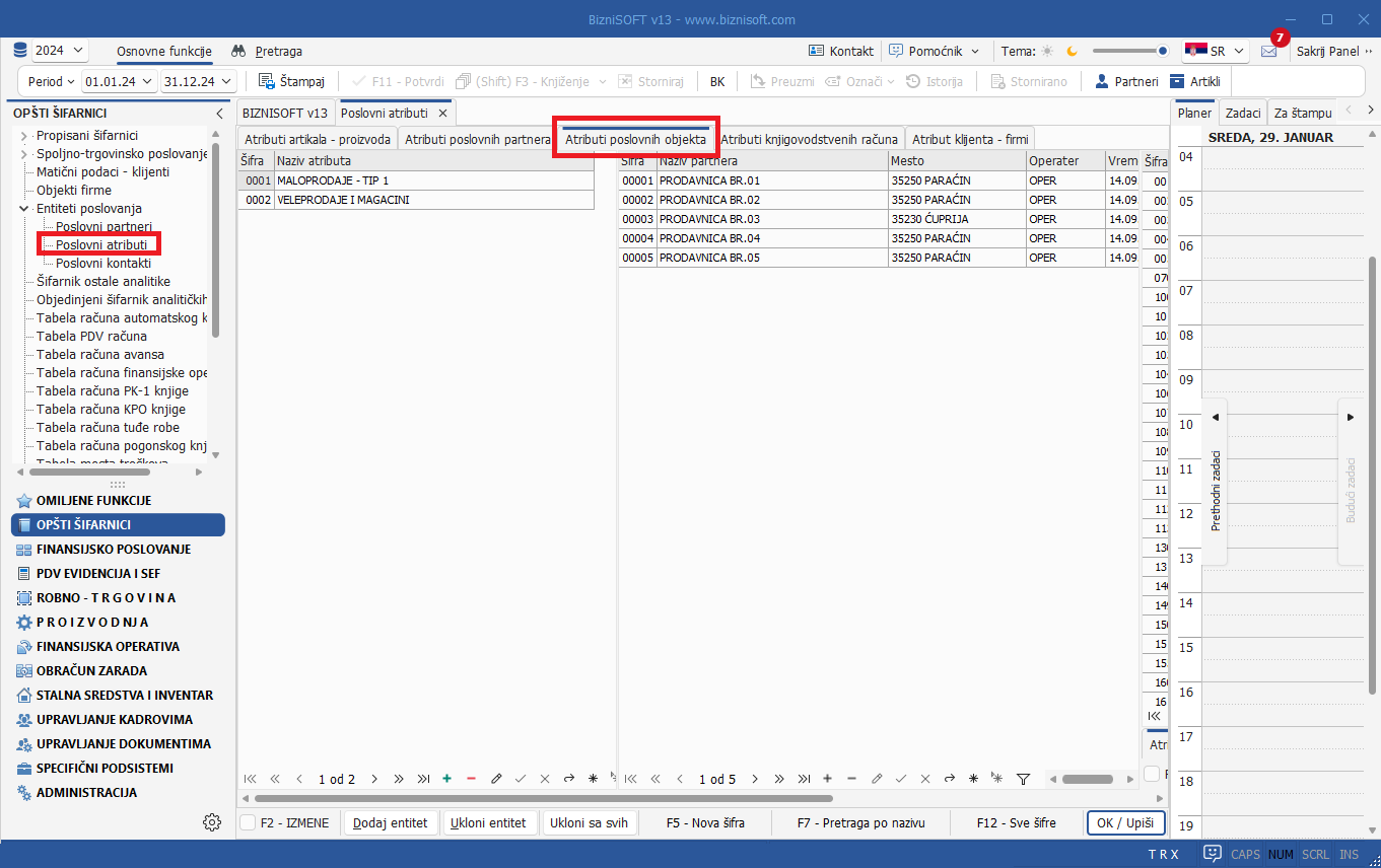 Dodata je nova vrsta atributa u entitetima poslovanja: Atributi poslovnih objekata. Ova funkcionalnost korisniku omogućava dodeljivanje atributa poslovnim objektima (analogno sličnoj funkcionalnosti koja se odnosi na artikle, partnere itd) u cilju adekvatnijeg izveštavanja za više poslovnih objekata koji pripadaju istom atributu:
