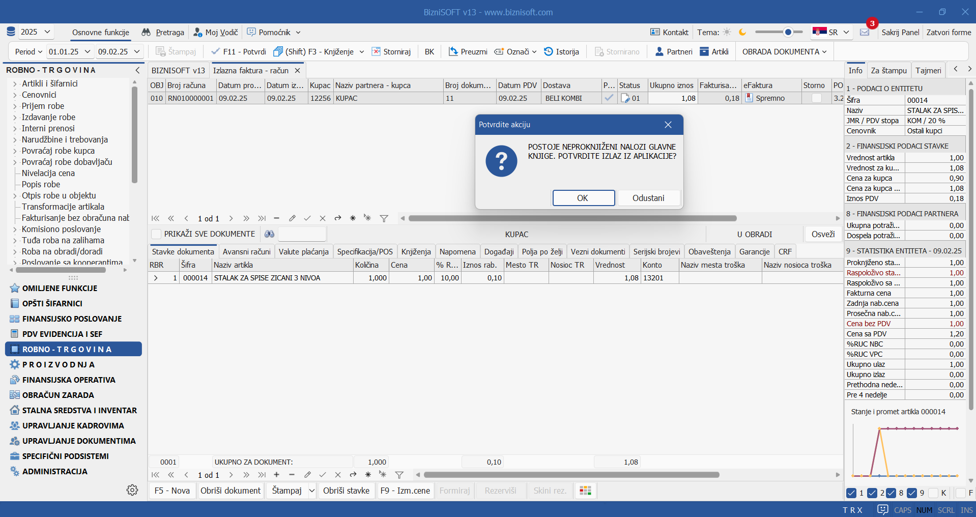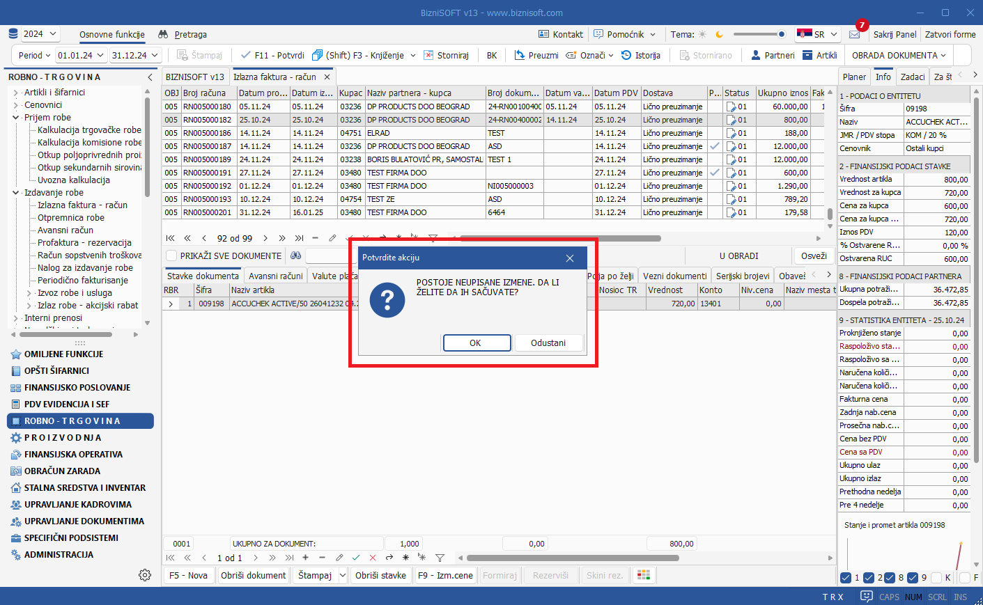 Prilikom zatvaranja bilo koje forme i/ili funkcije u Verziji 13, izvršiće se automatska provera da li postoje eventualno neupisani podaci. Ukoliko program detektuje neupisane izmene, prikazaće se sledeći dijalog: