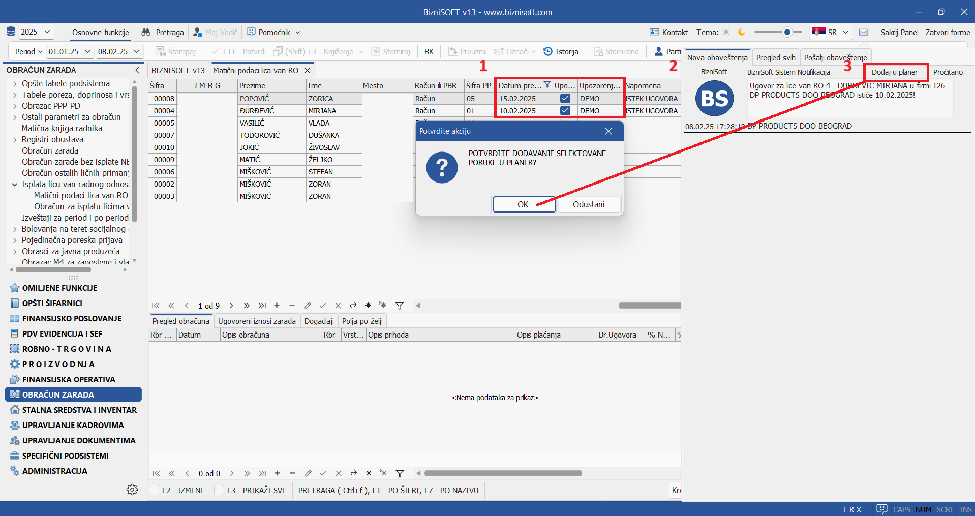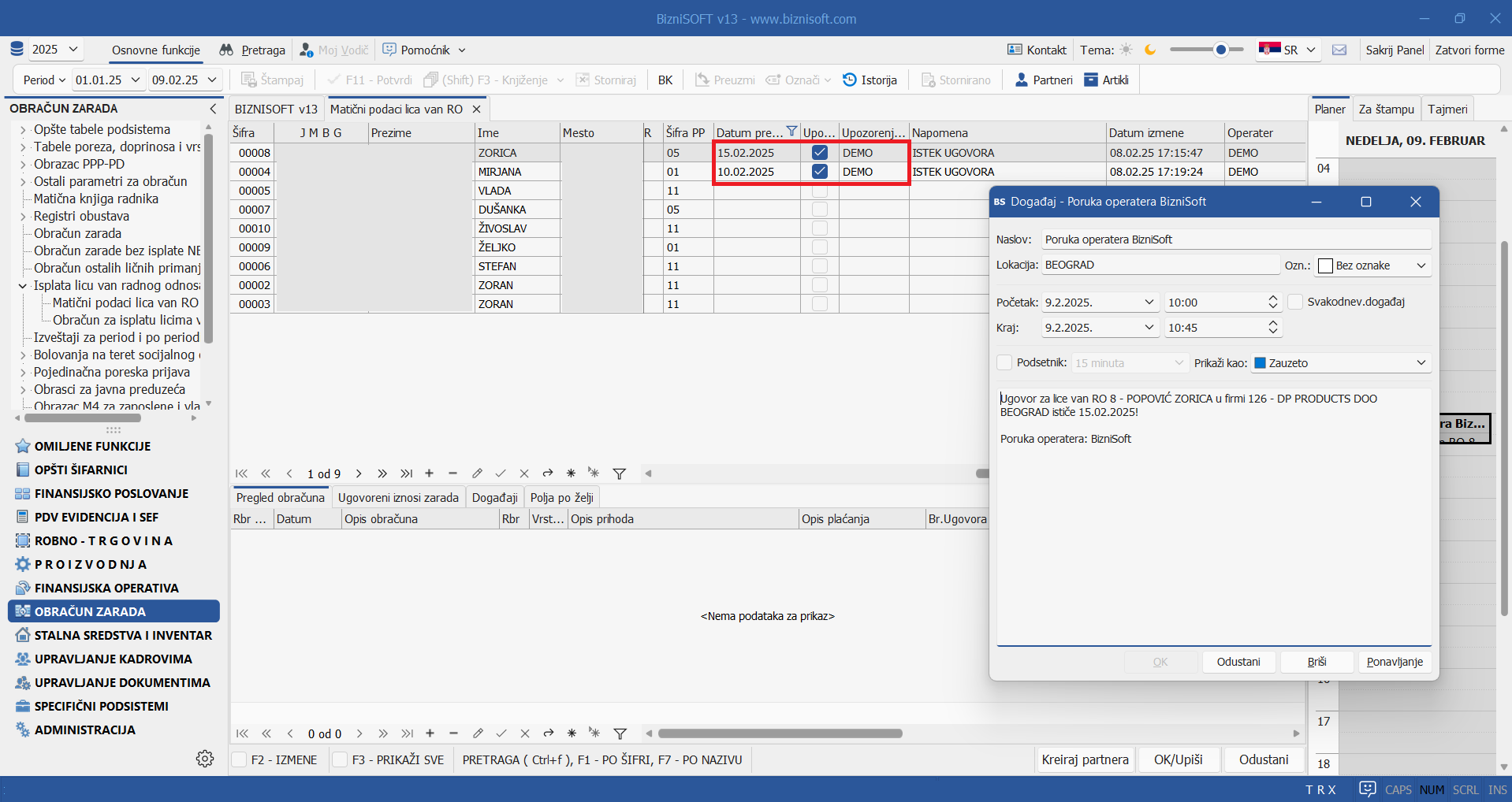 U tabeli Matični podaci lica van radnog odnosa dodata su dva nova polja: checkbox Upozorenje i Upozorenje operateru (polje za unos operatera) koja po uzoru na Matičnu knjigu radnika konsultuju parametar 10415 – Broj dana za upozorenje pred istek ugovora o radu i šalje operateru obaveštenje u vidu notifikacije na osnovu definisanog broj dana pred kojima će se upozorenje prikazivati. U daljim koracima, operateru je sistemom BizniSoft notifikacija omogućen unos selektovane poruke u planer: