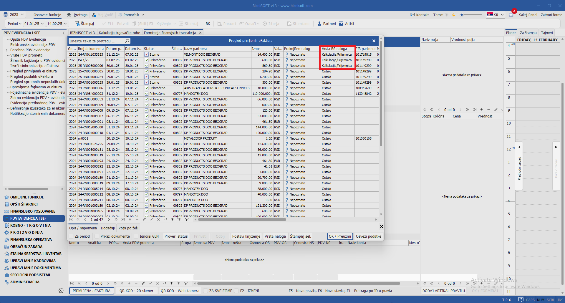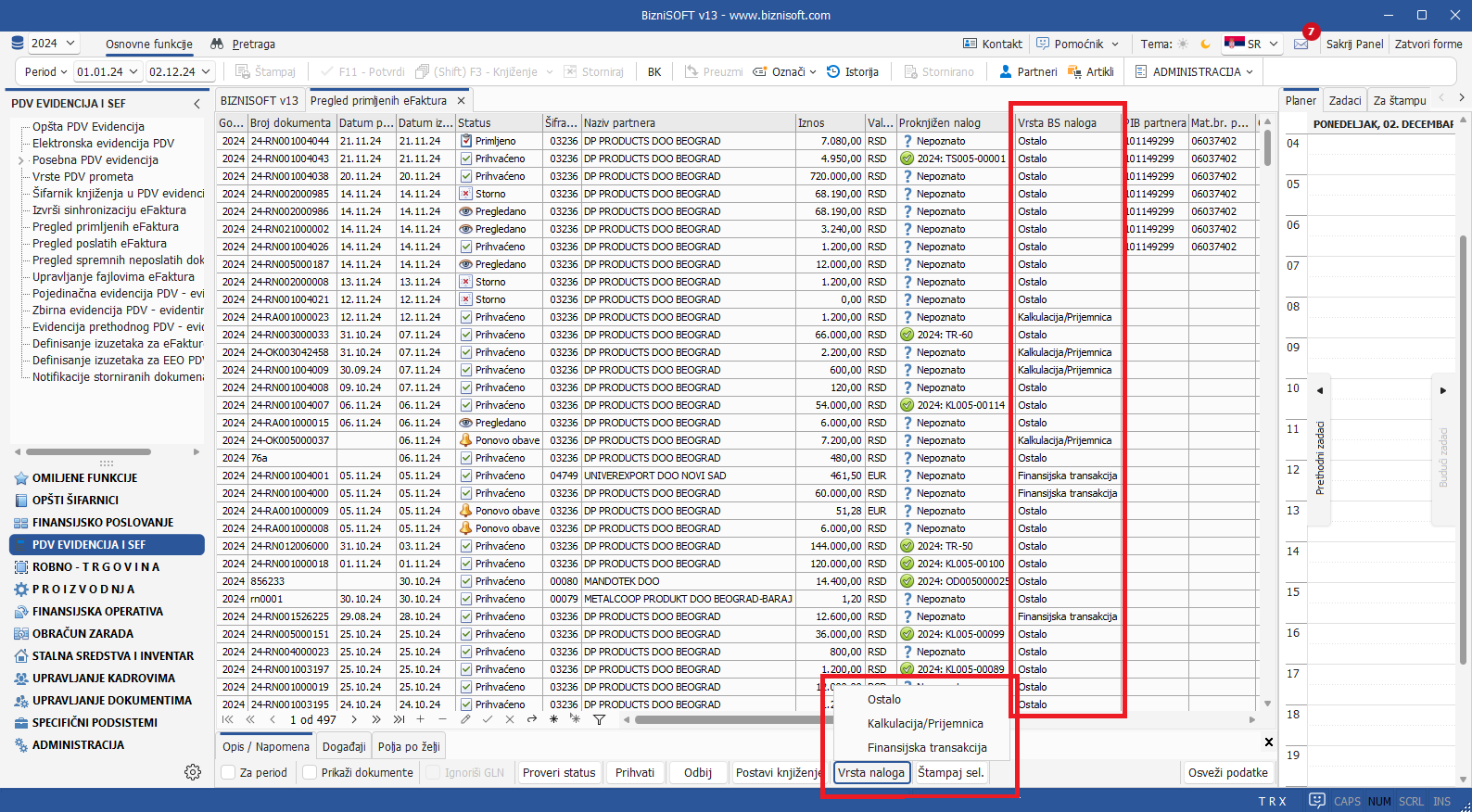 Implementirana je nova funkcija Vrsta BS naloga u formi Pregleda primljenih eFaktura kojom se definiše vrsta naloga koji će se kreirati na osnovu primljenog dokumenta. Ukoliko obeležje nije dodeljeno, podrazumevana vrednost će u koloni Vrsta BS naloga biti Ostalo. Ukoliko je za selektovani dokument definisano obeležje Kalkulkacija/Prijemnica ili Finansijska transakcija, prilikom formiranja dokumenta na osnovu primljene eFakture, program će ponuditi isključivo dokumente u formi za koje je prethodno definisan tip naloga: