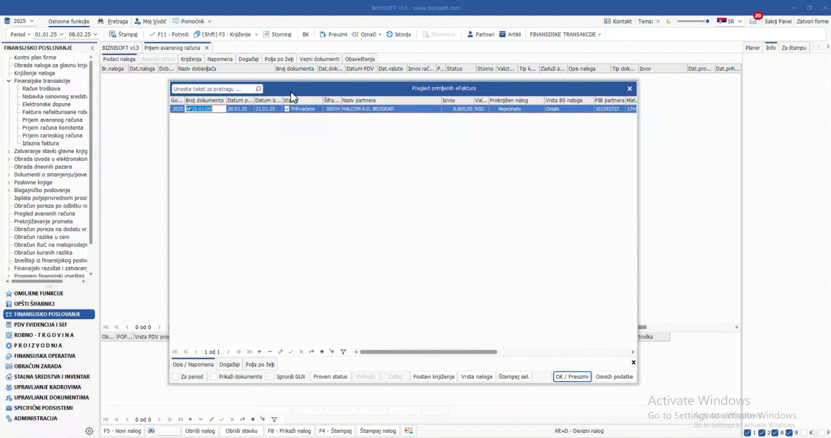 Omogućeno je formiranje prijema avansnih računa u delu finansijskih transakcija na osnovu primljenog avansnog računa sa SEF-a: