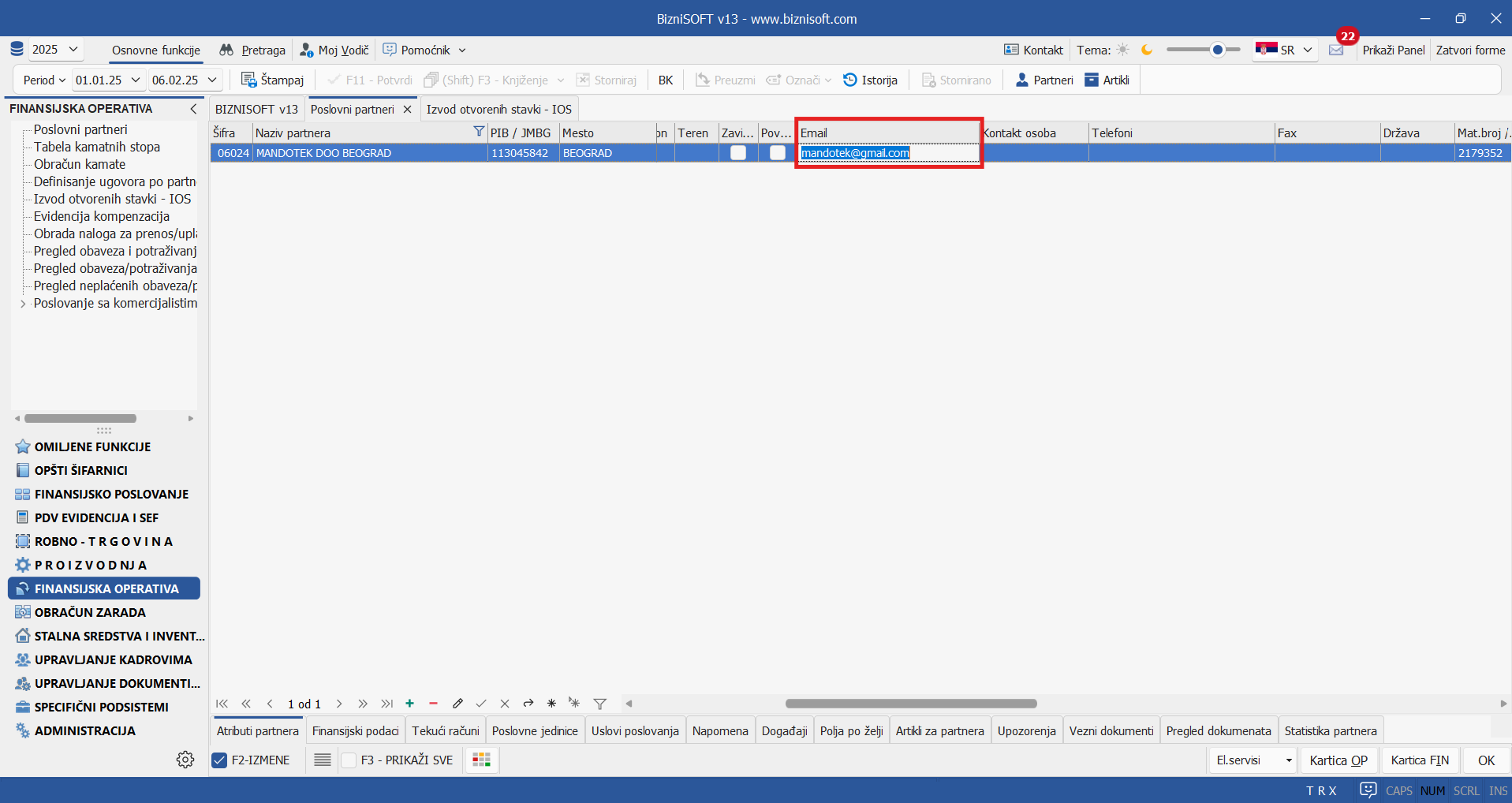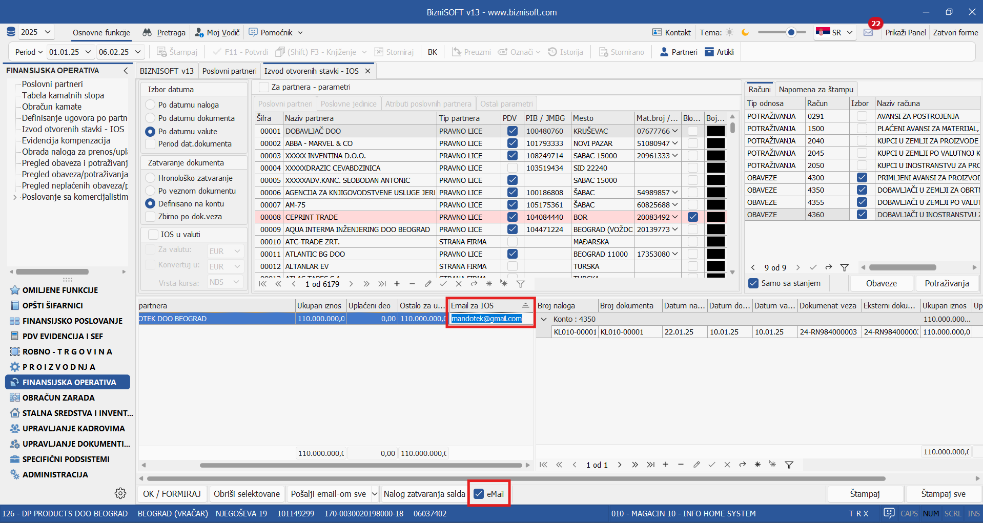 U novim postavkama verzije, prikaz kolone Email za IOS u formi Izvoda otvorenih stavki omogućen je aktivacijom novog checkbox-a eMail. Procedura identifikovanja mail-a za IOS je dodatno unapređena: ukoliko u Šifarniku poslovnih partnera ne postoji podatak u koloni Email za IOS, program će konsultovati mail adresu iz kolone Email: