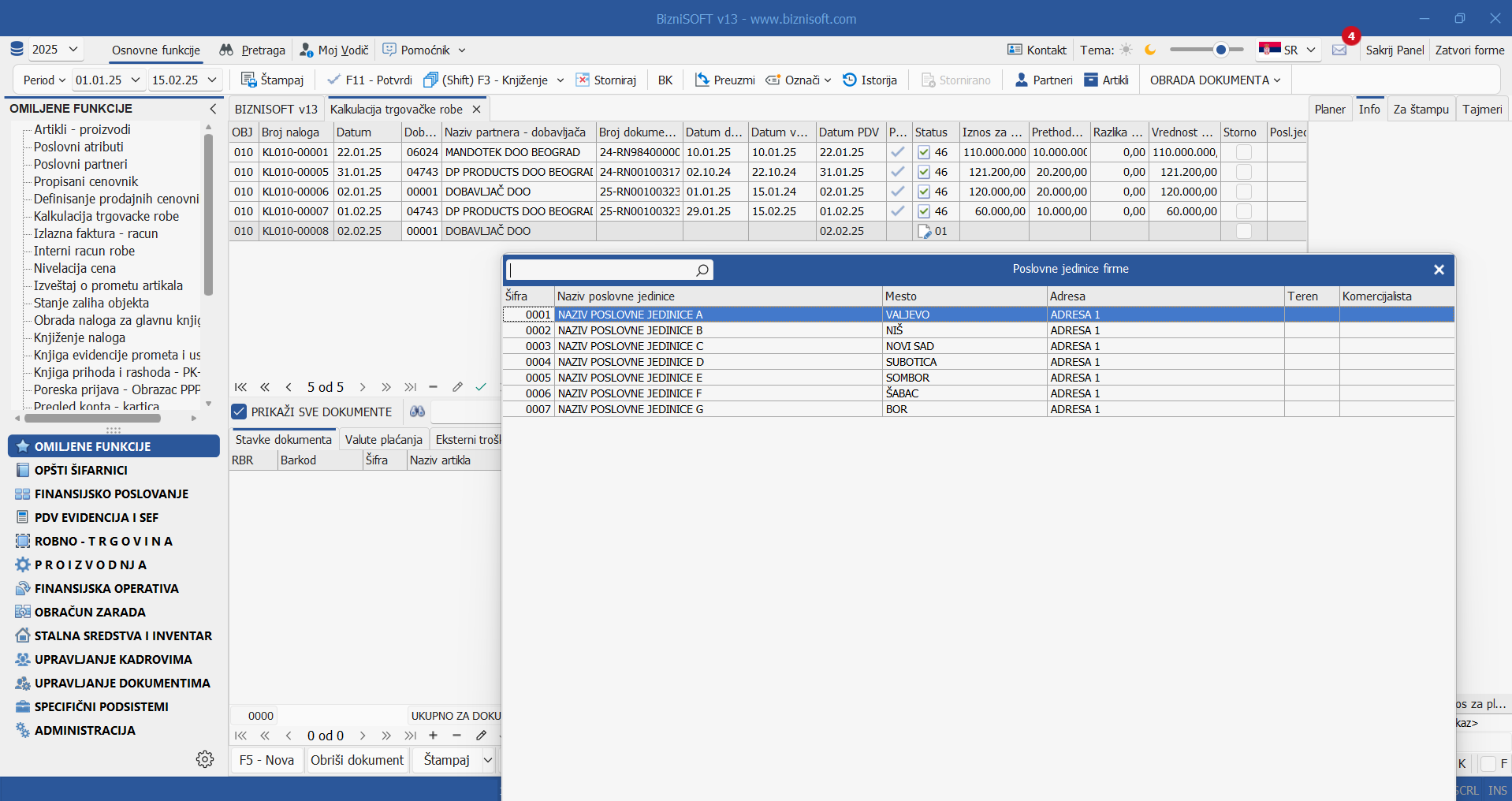 U zavisnosti od definisanog polja Posl.jed.tip program će prilikom unosa šifre partnera zatražiti unos poslovne jedinice u adekvatnom dokumentu. Primer: ukoliko je definisano Potraživanja ili Sve unos poslovne jedinice u fakturama će biti obavezan (pod pretpostavkom da je operater na nivou šifarnika partnera definisao odgovarajuće poslovne jedinice). Ukoliko je definisano Obaveze ili Sve program će zatražiti unos poslovne jedinice za poslovnog partnera u kalkulacijama (i nasleđenim tabelama) kao i u finansijskim transakcijama: u formama računa troška, nabavke osnovnog sredstva i prijema avansnog računa: