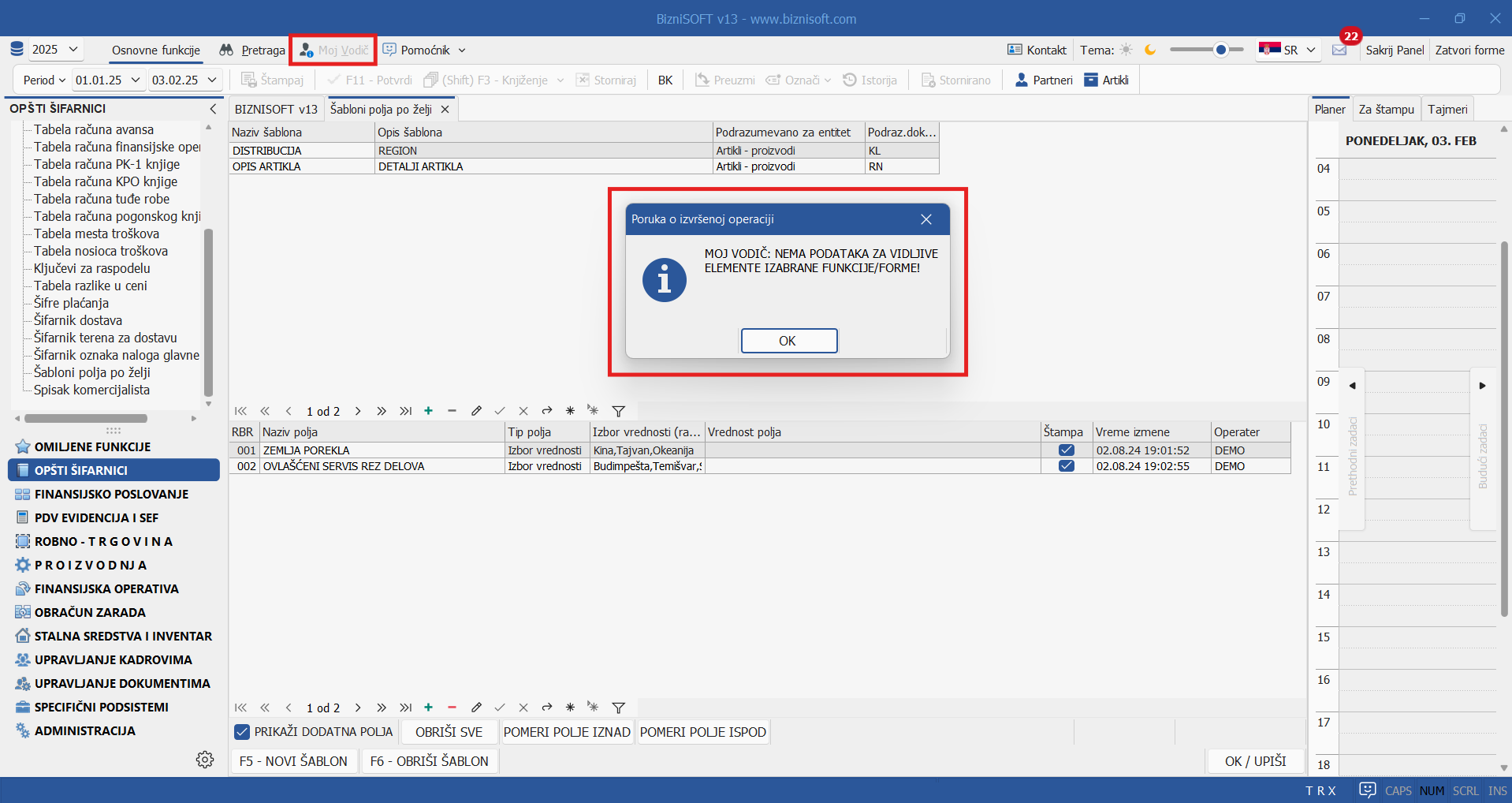 Ukoliko za selektovanu formu ne postoji tekst u bazi za Moj Vodič, to će kao indikator biti jasno istaknuto bledim fontom, uz prateću sistemsku poruku: Moj Vodič: Nema podataka za vidljive elemente izabrane funkcije/forme!