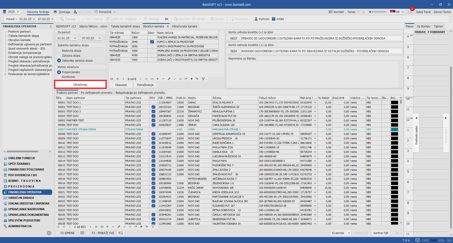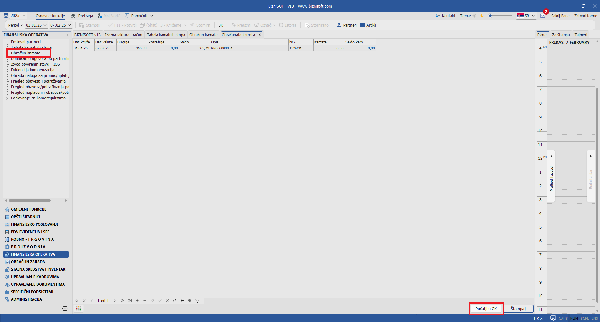 U najnovijim postavkama verzije, u formi Obračun kamate omogućeno je automatsko formiranje naloga glavne knjige klikom na polje Pošalji u GK. Konsultovanje kontnog plana za izbor konta prihoda i rashoda, standardno je omogućen pomoću tastera +: