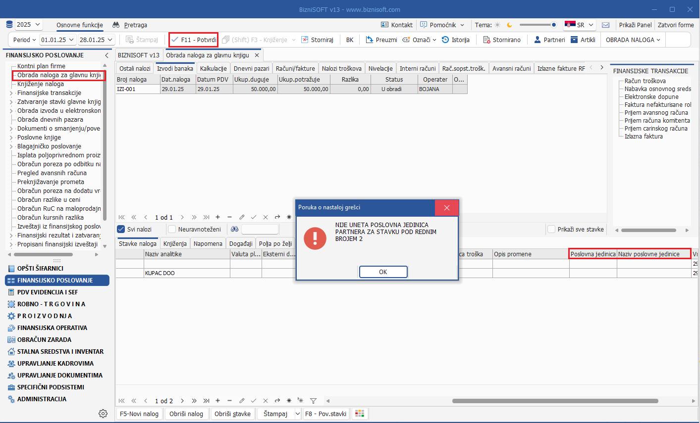 Polje Posl.jed.uplate služi da se „forsira“ provera obaveznog unosa poslovne jedinice prilikom unosa izvoda u funkciji obrade naloga glavne knjige. U zavisnosti od statusa ovog polja, konta i partnera, prilikom potvrde naloga, ukoliko nije uneta poslovna jedinica program će javiti sledeću grešku: