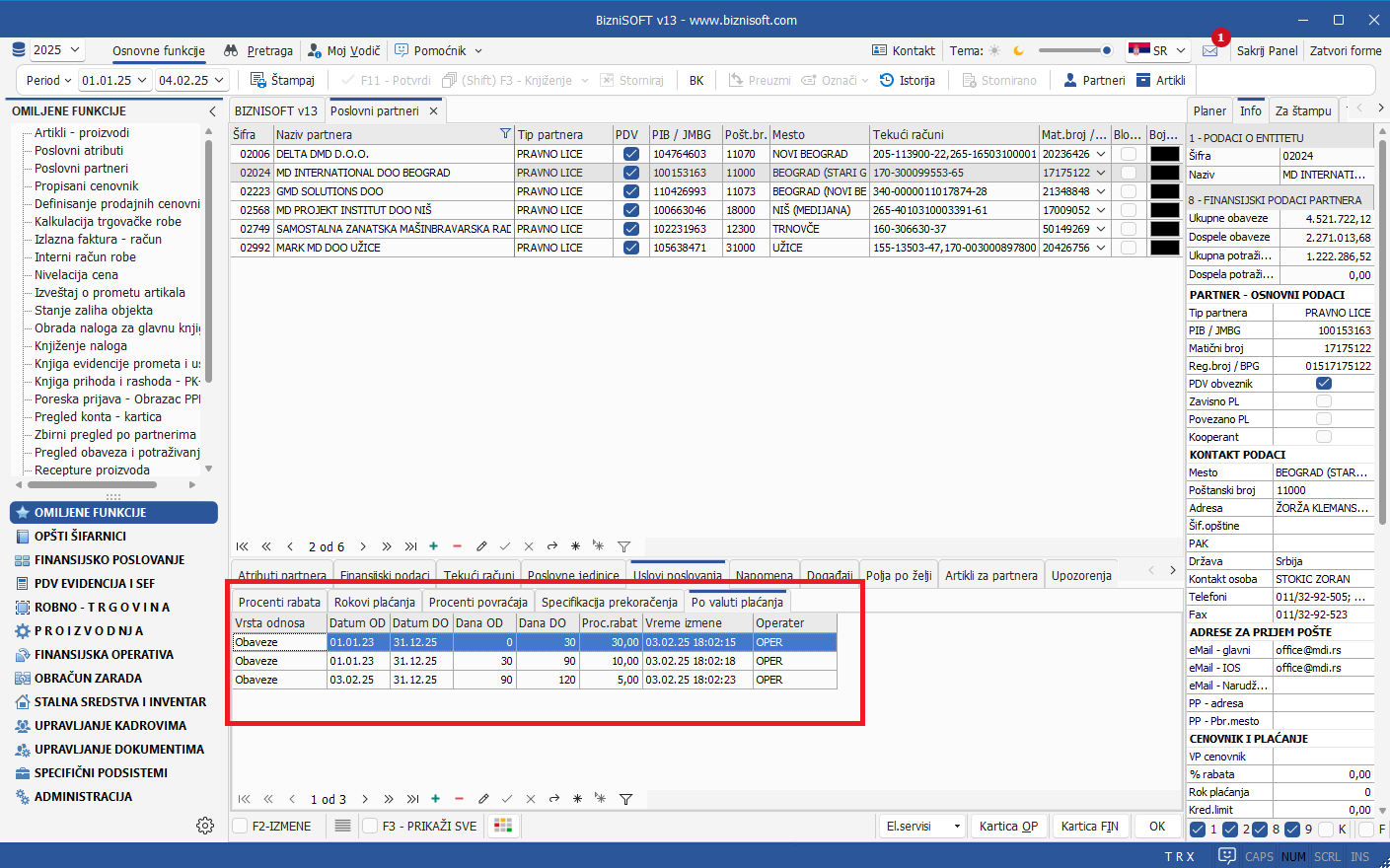 U Šifarniku poslovnih partnera u delu Uslovi poslovanja, dodat je nov tab pod nazivom Po valuti plaćanja namenjen unosu podataka na osnovu Ugovora sa konkretnim partnerom (bez obzira da li je on dobavljač – pa će u tom slučaju biti dodeljeno obeležje Obaveze ili je kupac sa obeležjem Potraživanja ili je i jedno i drugo):