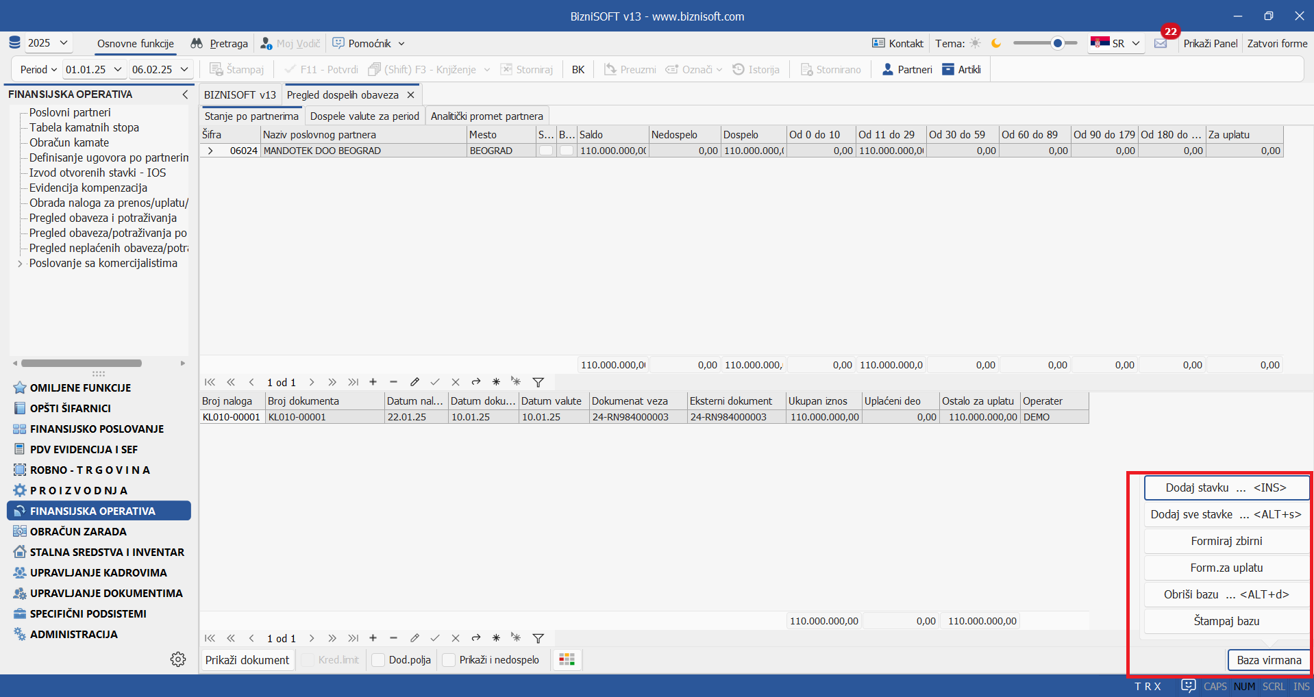 Sve funkcije za formiranje virmana koje su se u prethodnim verzijama nalazile u status bar-u, sada su grupisane u posebnoj listi koja se pokreće klikom na polje Baza virmana: