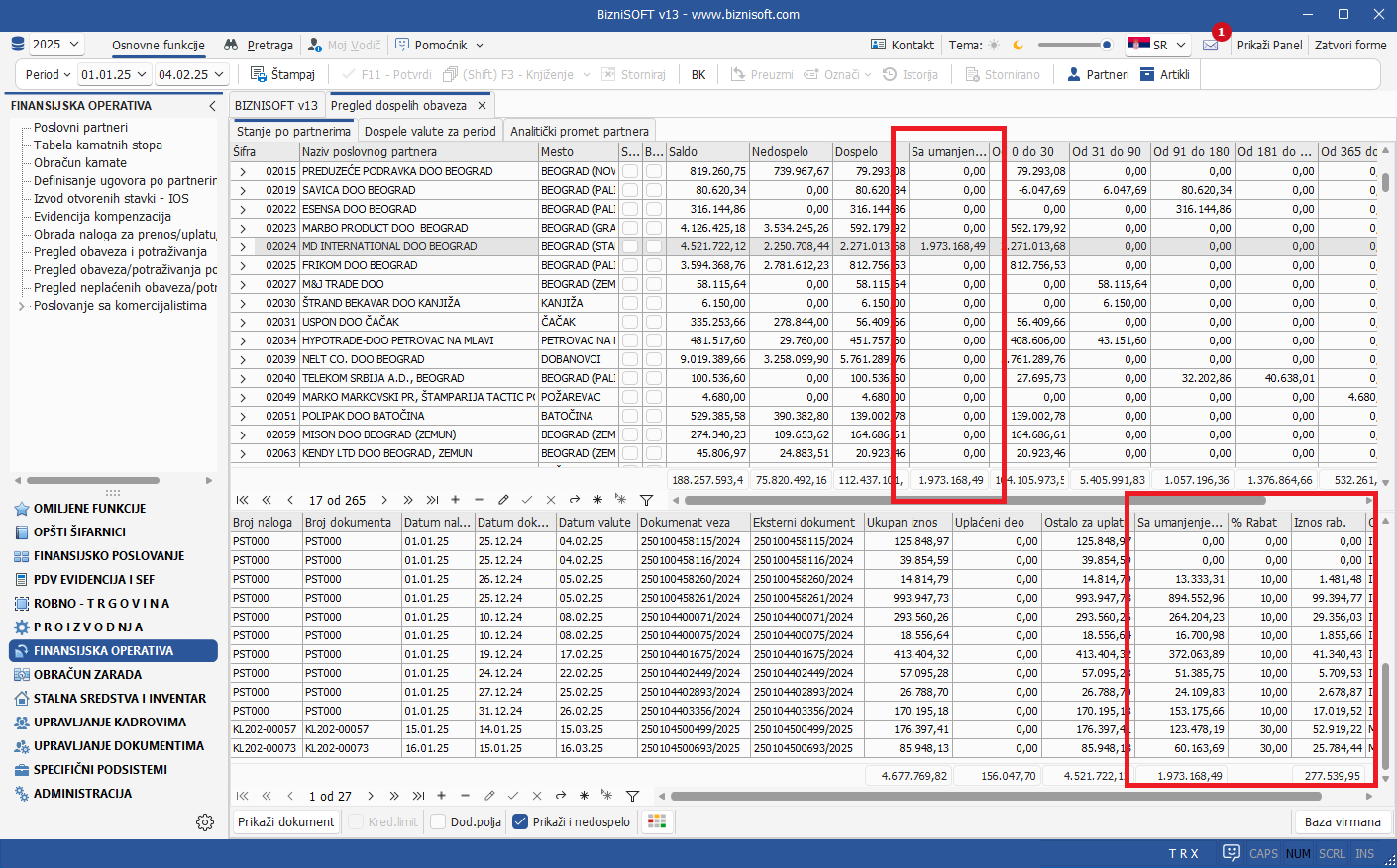 U skladu sa tim, unapređena je funkcionalnost Pregled obaveza i potraživanja i prikaz nedospelih potraživanja uvođenjem više novih kolona: u gornjoj tabeli, u koloni Sa umanjenjem po ugovoru, prikazuje se podatak kolika je ukupna obaveza prema dobavljaču sa umanjenjem po ugovoru, a u donjoj tabeli (pod uslovom da je čekirano polje Prikaži nedospelo) nove tri kolone koje daju podatak o tome kolika će ušteda po ugovoru biti ostvarena ukoliko uplata svih nedospelih obaveza budu izvršena danas: