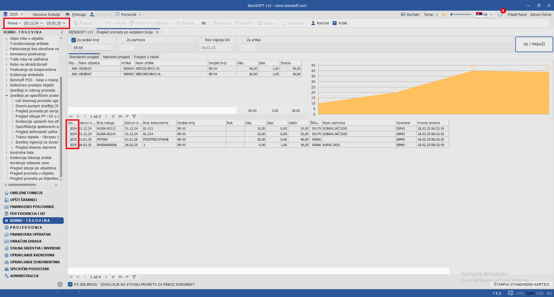 Omogućeno je formiranje izveštaja Pregleda prometa po serijskom broju i za prethodne godine konsultovanjem kompletnog perioda definisanog u zaglavlju BizniSoft-a: