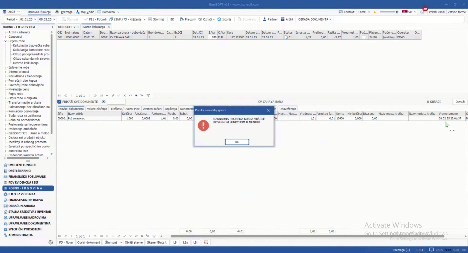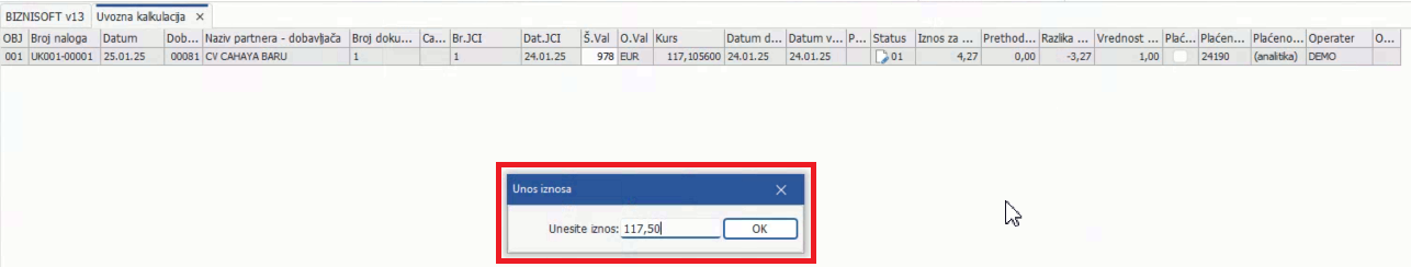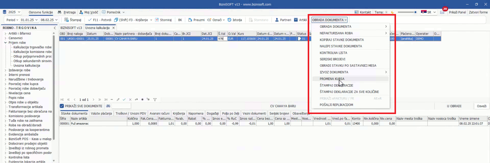 U formi Uvozna kalkulacija u meniju Obrada dokumenta je dodata je nova opcija Promena kursa čime je omogućena naknadna korekcija kursa na željeni datum: