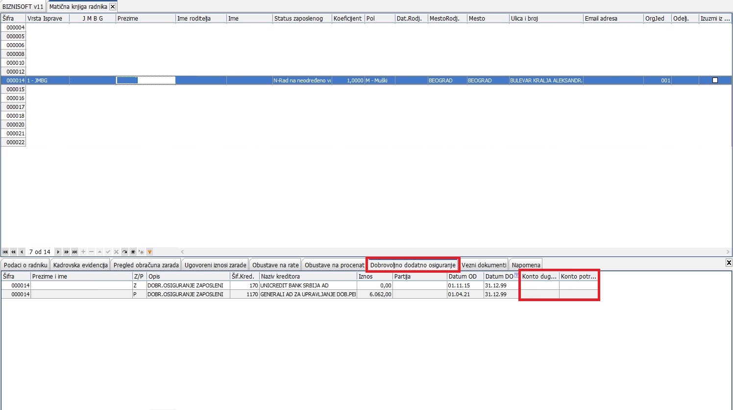 OBRAČUN ZARADAU postavci verzije Build: bsv110-21429 Rel. date: 02.12.2021. u Matičnoj knjizi radnika, u tabovima [bluetext]Obustave na rate[/bluetext], [bluetext]Obustave na procenat[/bluetext], [bluetext]Dobrovoljno dodatno osiguranje[/bluetext] više se ne nudi automatski konto, ali je omogućeno konsultovanje kontnog plana firme pomoću tastera plus: