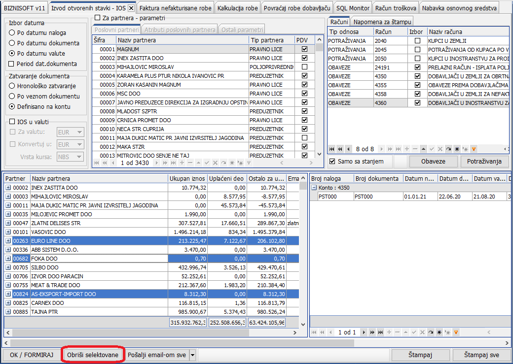 Omogućeno je selektovanje više partnera u formi IOS-a i brisanje svih klikom na dugme [bluetext]Obriši selektovane[/bluetext]: