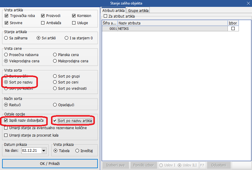 U izveštaju [bluetext]Stanje zaliha objekta[/bluetext] implementiran je novi checkbox [bluetext]Sort po nazivu artikla[/bluetext]. Ukoliko je odabrana opcija Vrsta sorta: [bluetext]Sort po nazivu[/bluetext] i [bluetext]Ostale opcije: Ispiši naziv dobavljača – Sort po nazivu artikla[/bluetext], u izveštaju će prioritet sortiranja biti naziv artikla: