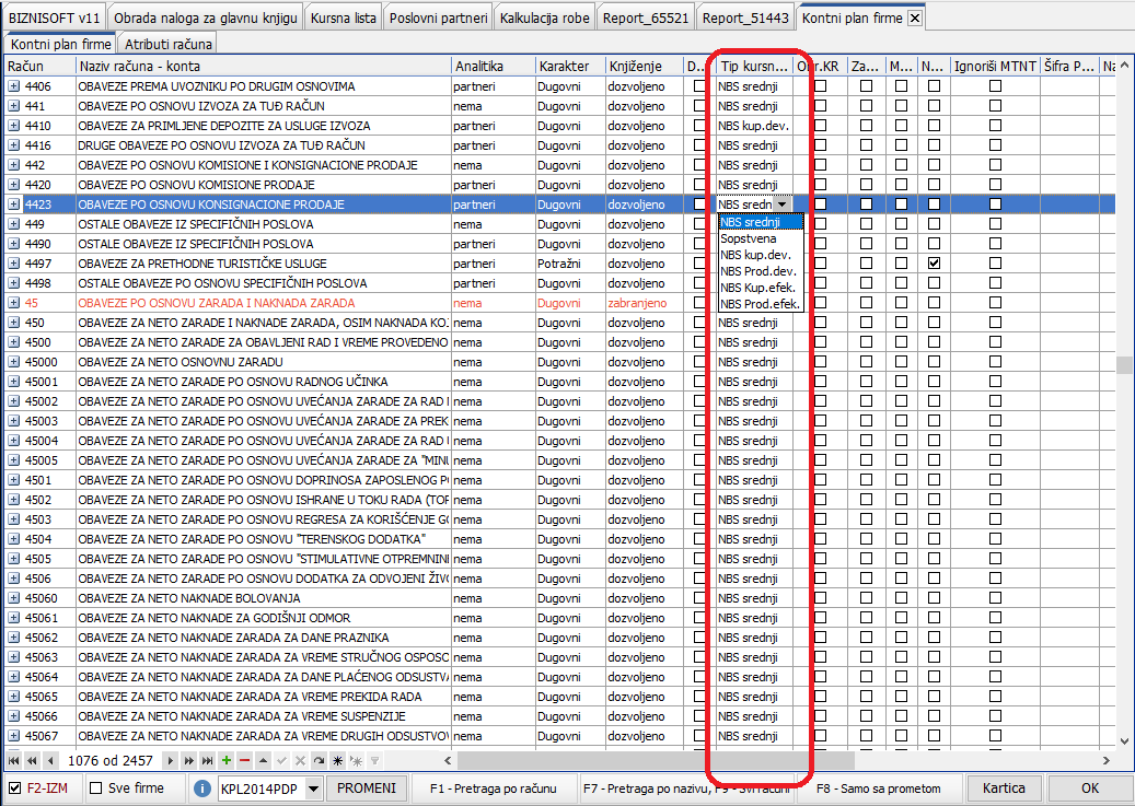 Implementirano je novo polje u kontnom planu, kolona [bluetext]Tip kursne liste[/bluetext] kojom se može definisati tip kursa koji se koristi prilikom kursiranja u funkciji obrade naloga glavne knjige uz napomenu da će u slučaju da se konkretan konto vodi analitički po poslovnim partnerima konsultovati onaj tip kursne liste koji je definisan za konkretnog poslovnog partnera: