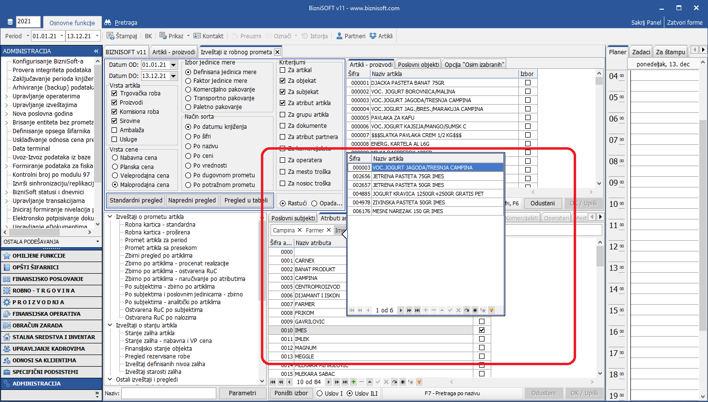 Na zahtev korisnika, u [bluetext]Izveštajima iz robnog prometa[/bluetext] implementirana je funkcionalnost selektovanja više stavki pomoću prečice CTRL+levi klik. Klikom na novo dugme [bluetext]Izaberi selektovano[/bluetext] svi izabrani artikli će biti automatski čekirani u koloni [bluetext]Izbor[/bluetext]: