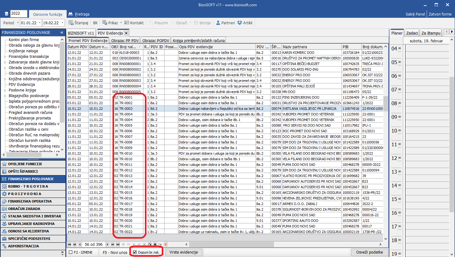 Implementiran je novi checkbox u [bluetext]PDV Evidenciji[/bluetext] pod nazivom [bluetext]Dopuni br.nal.[/bluetext] Ukoliko je ova opcija štiklirana, svi nalozi koji počinju sa [bluetext]TR-, OS-, AR-[/bluetext] itd biće dopunjeni vodećim nulama radi daljeg pravilnog sortiranja u koloni. Ova opcija dopunjuje broj naloga u svim tabelama (PDV prometa, Knjiga primljenih/izdatih računa itd):